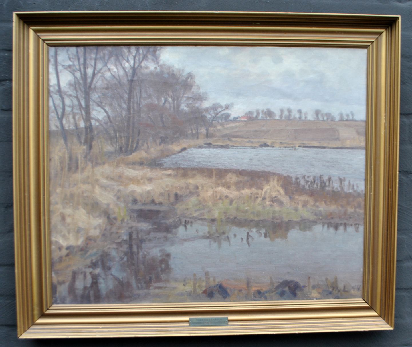 Larsen, Thorvald (1881 - 1947) Danmark: Landskab med sø. Olie på lærred. Signeret: Th. L 1944. 58 x 71 cm.