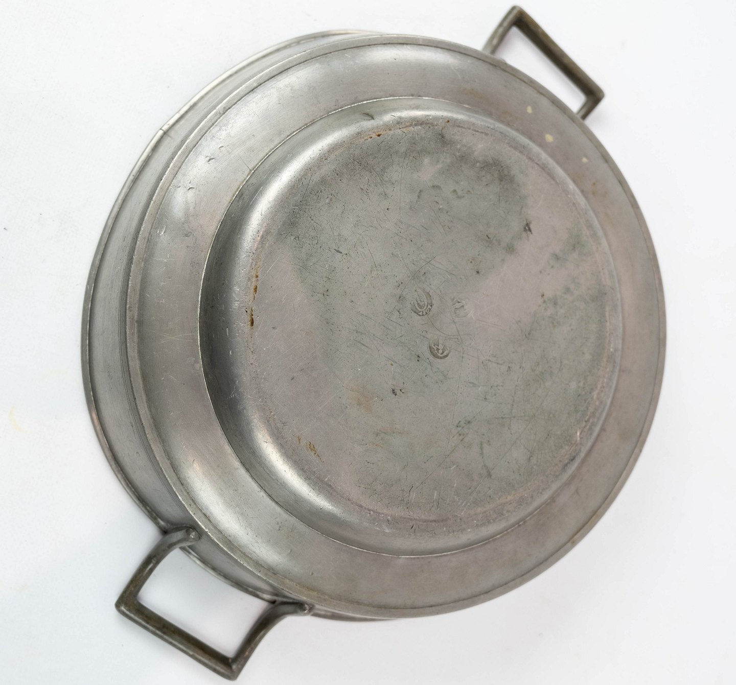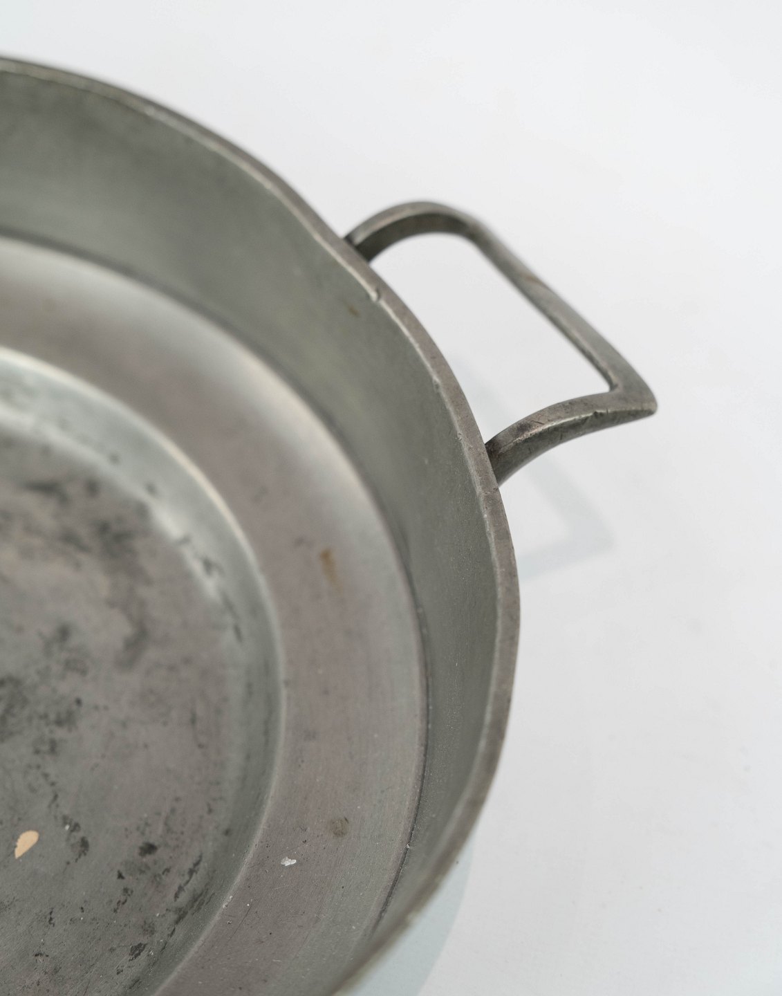 Rundt tinfad med håndtag, i flot brugt stand fra 1860.