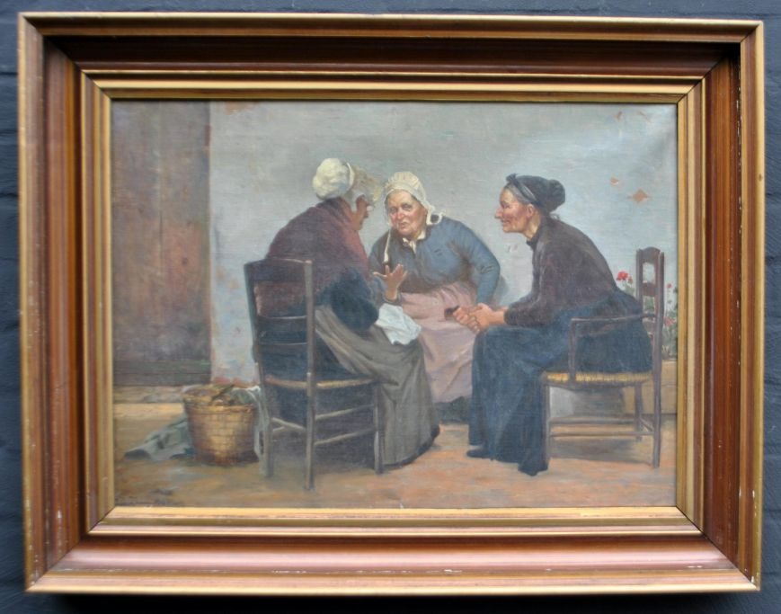 Simony Jensen, Oluf (1864 - 1923) Dänemark: Drei Frauen im Gespräch. Öl auf Leinwand. Signiert 1902. 45 x 60 cm.