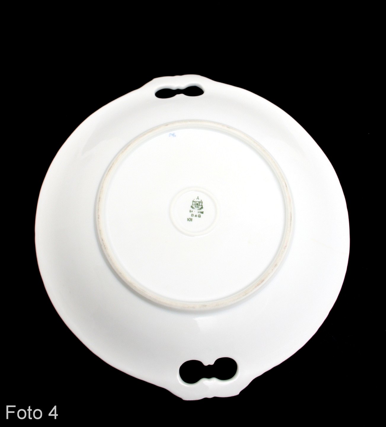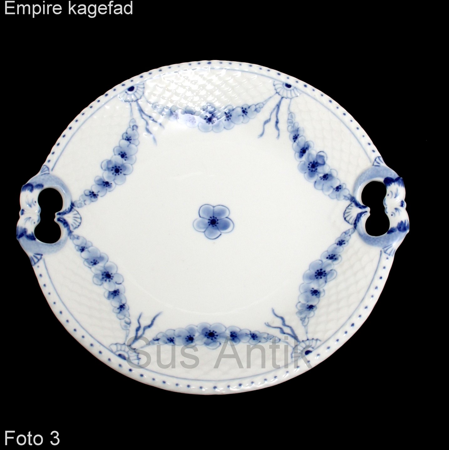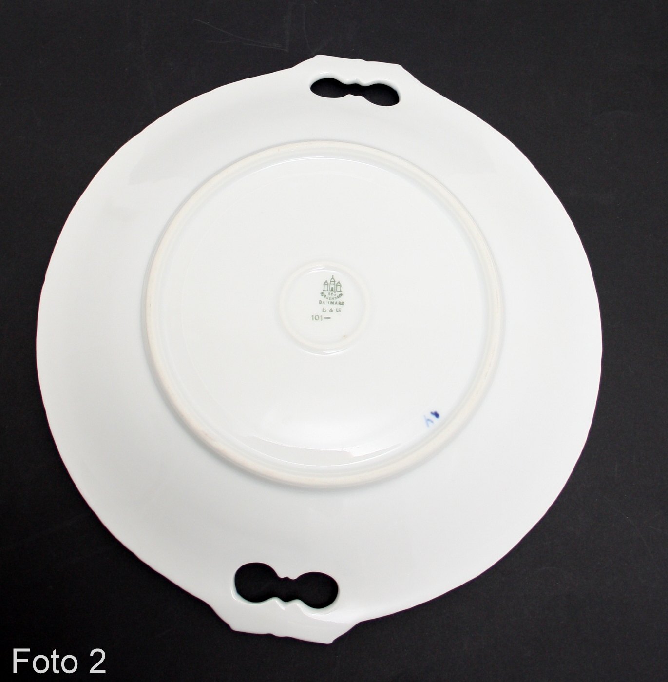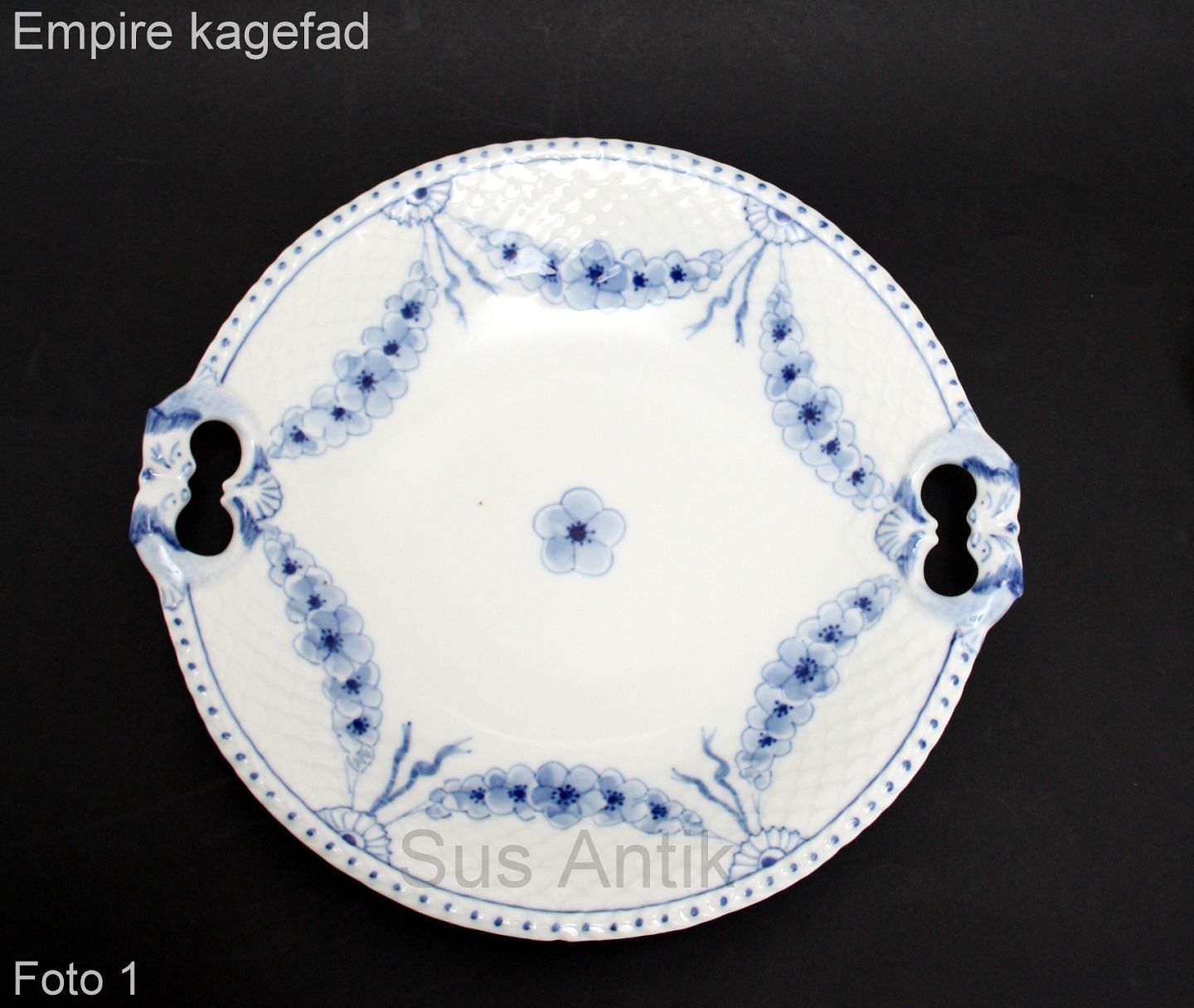 Text available in Danish: Bing & Grøndahl, Empire, Kagefad med ører. Formnr 101. Diameter 25 cm. II. sortering. Foto 1 glasurfejl. Foto 2 brændingsplet ellers fin og hel stand. Pris: 325 kr. stk. Lager: 2