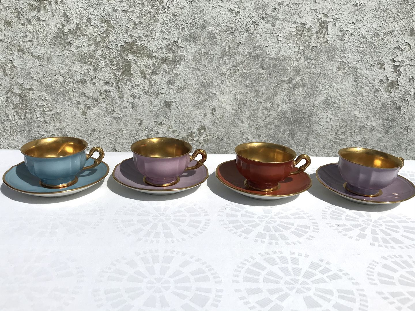 Colored mocha cups with gold, 6.7cm in diameter, 4cm high, Blue, Light purple, Brown, Dark purple * Nice slightly worn condition * Stamped F, Fürstenberg, Germany.