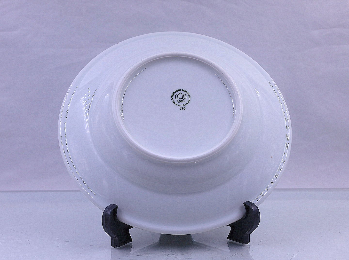 Text available in Danish: Bing & Grøndahl. Hotelporcelæn Egetræ, Grødtallerken nr. 710. Restaurants porcelæn, hvidt porcelæn med stiliseret, blåt, egetræ som dekoration.