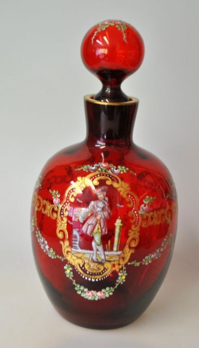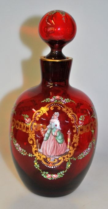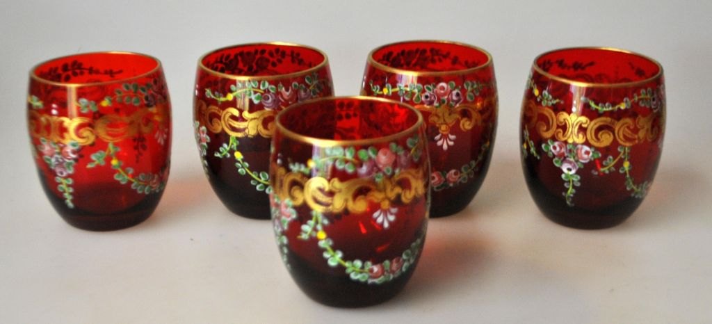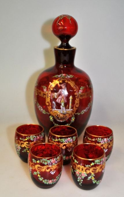 Venetian liqueur set in ruby red glass with enamel painting, approx. 1950, Italy. Compagnia Venezia e Murano. The set consists of a carafe with a stopper and 5 identical glasses. Hand-painted decorations in the form of scenes with man and woman in rococo costumes by gondolas. In addition, the rose decorations and gilding. Height carafe with stopper: 22 cm. Glass height: 5 cm.