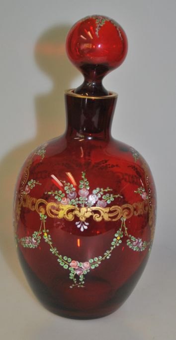 Venetian liqueur set in ruby red glass with enamel painting, approx. 1950, Italy