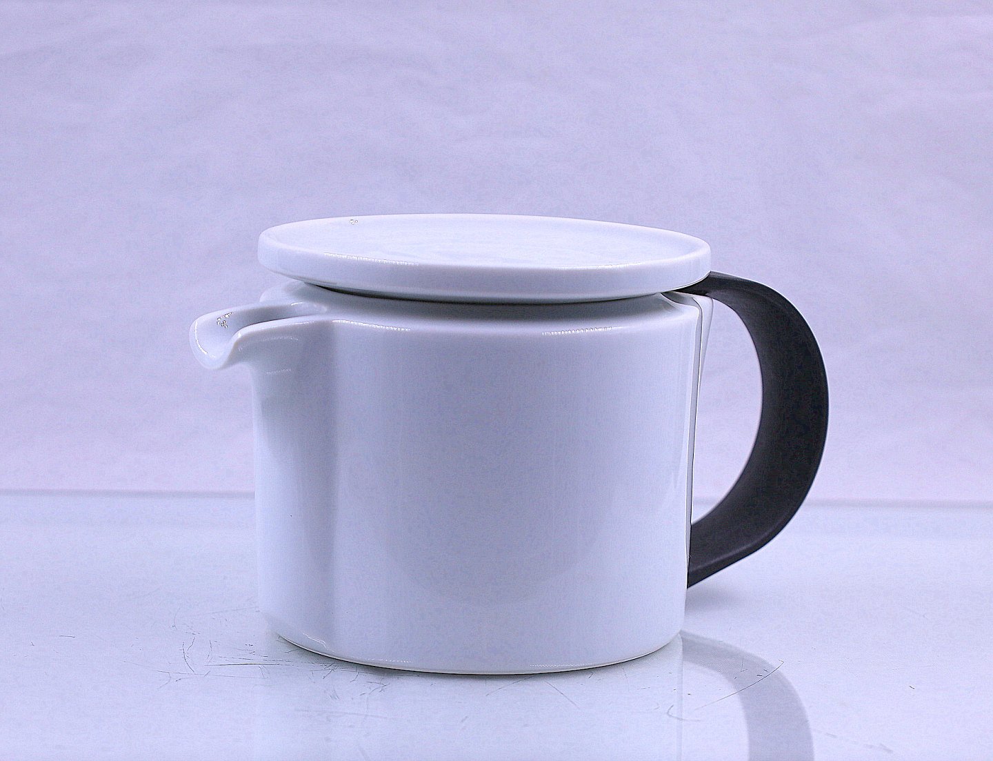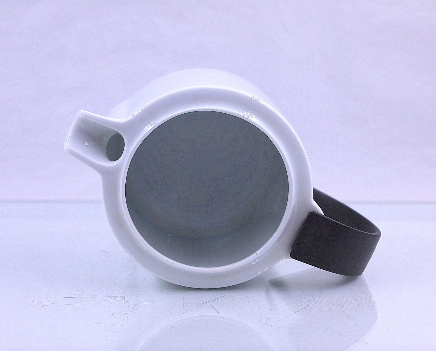 Text available in Danish: Bing & Grøndahl. Tekande, Hank, nr. 831. Tekande er af hvidt porcelæn med sort hank.