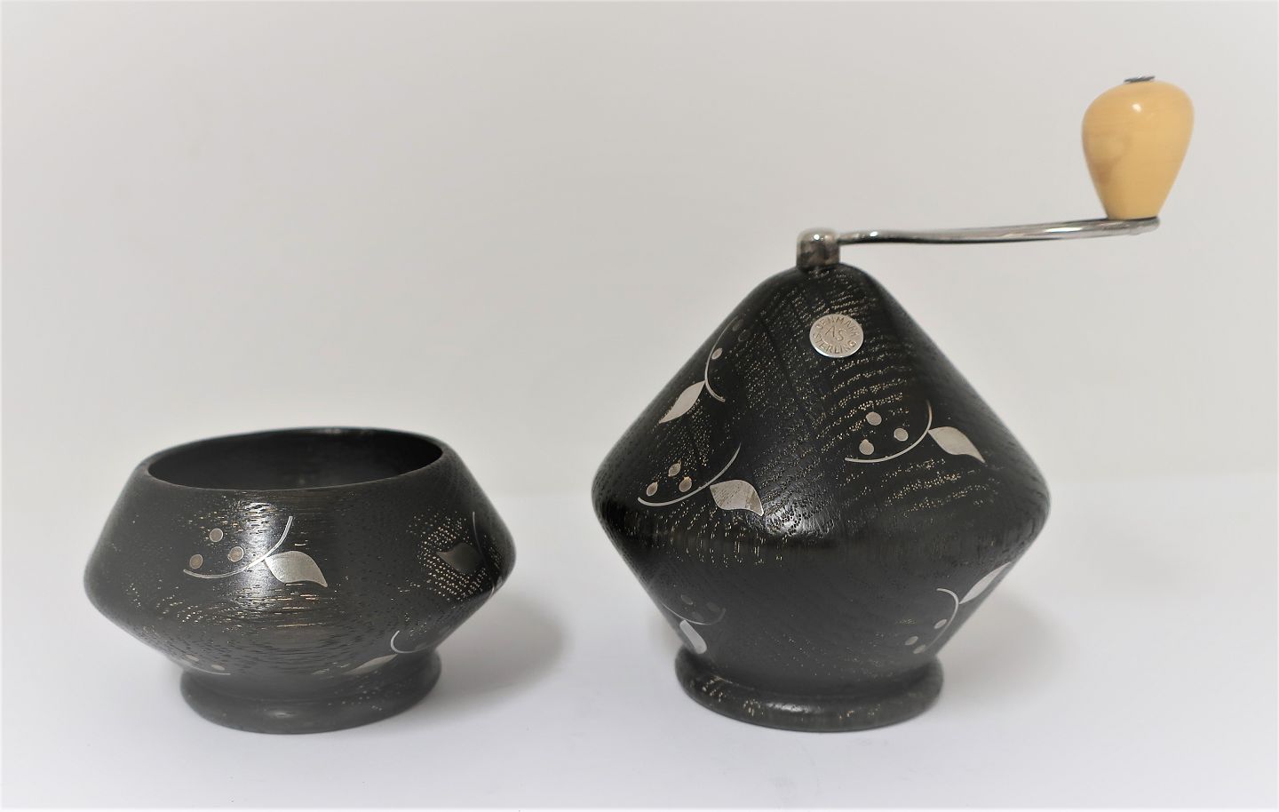 Pepper grinder and salt shaker with silver (925) inlay. Stamped AS. Height of pepper grinder 10 cm.