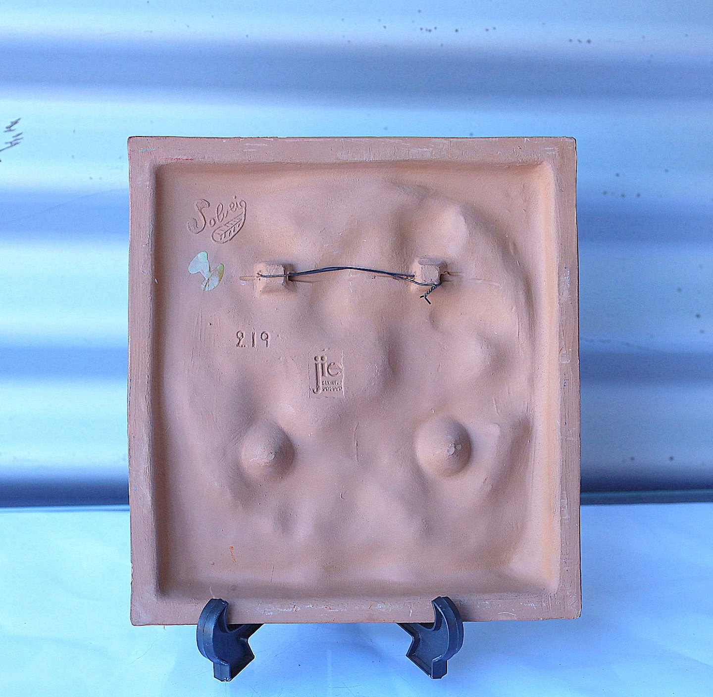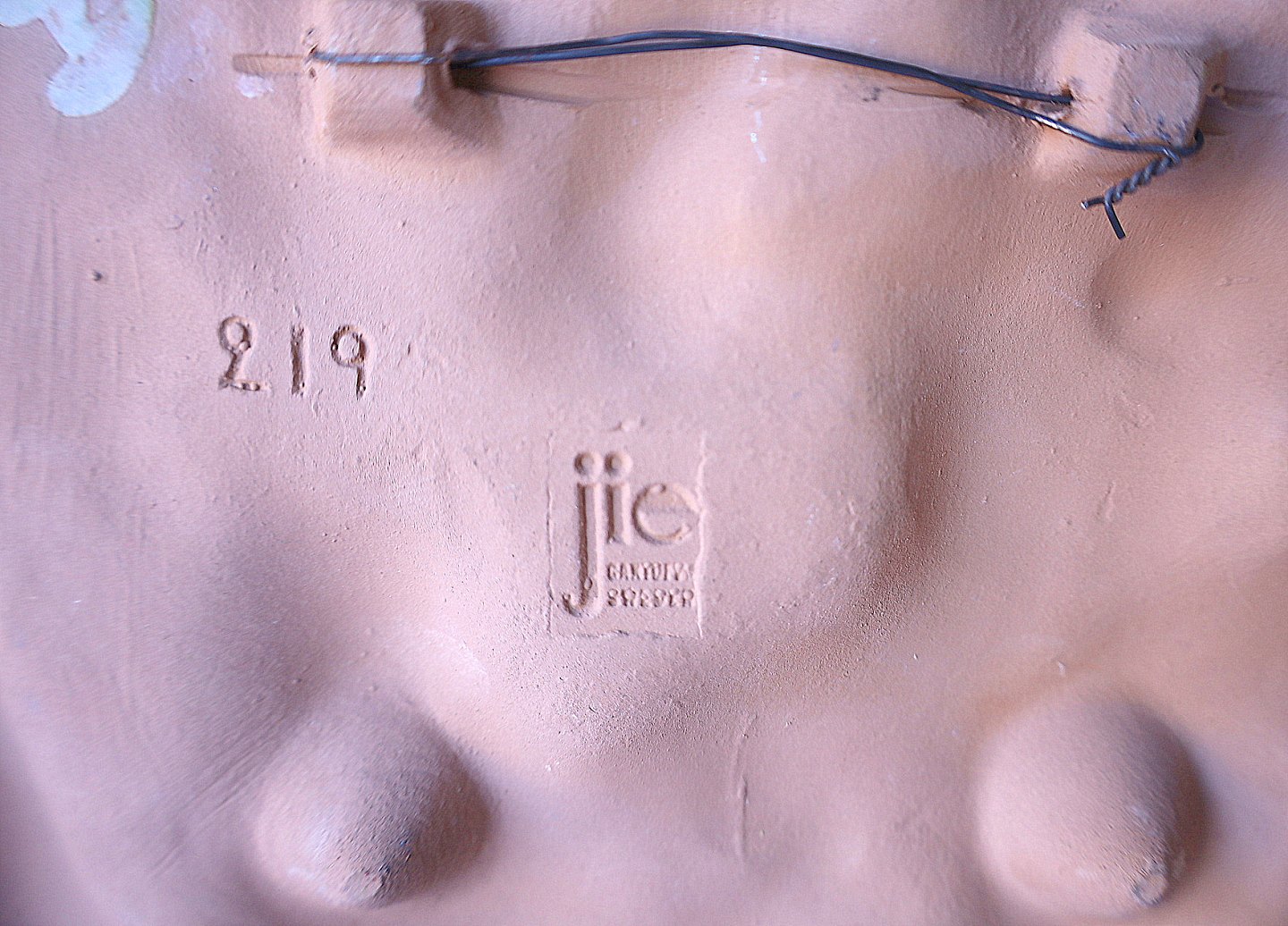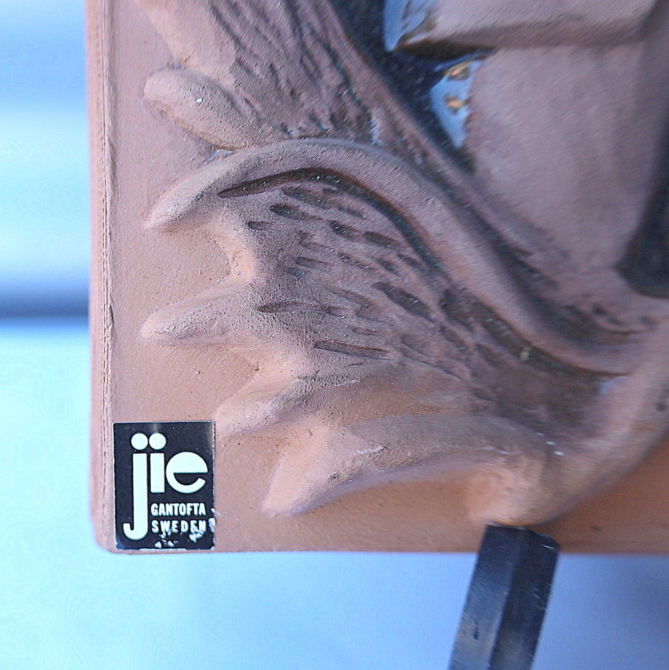 Text available in Danish: Relief, nr. 219, JIE, Gantofta, Sweden. Relief med motiv af en jæger, med gevær, og hans hund. Relieffet er i rødler og kun, lidt, grøn glaseret.