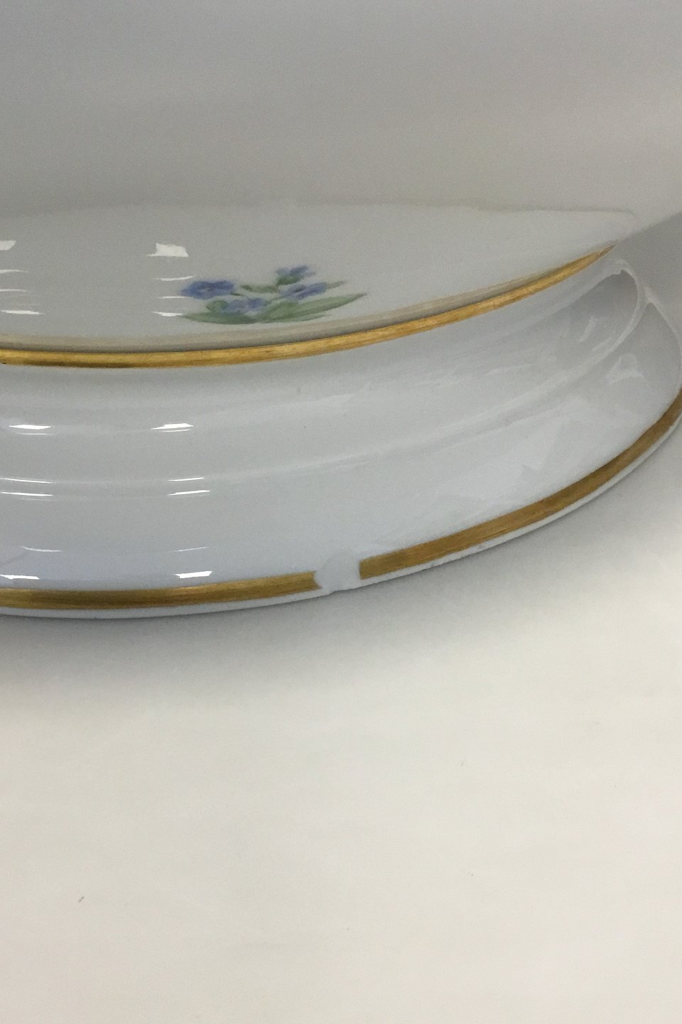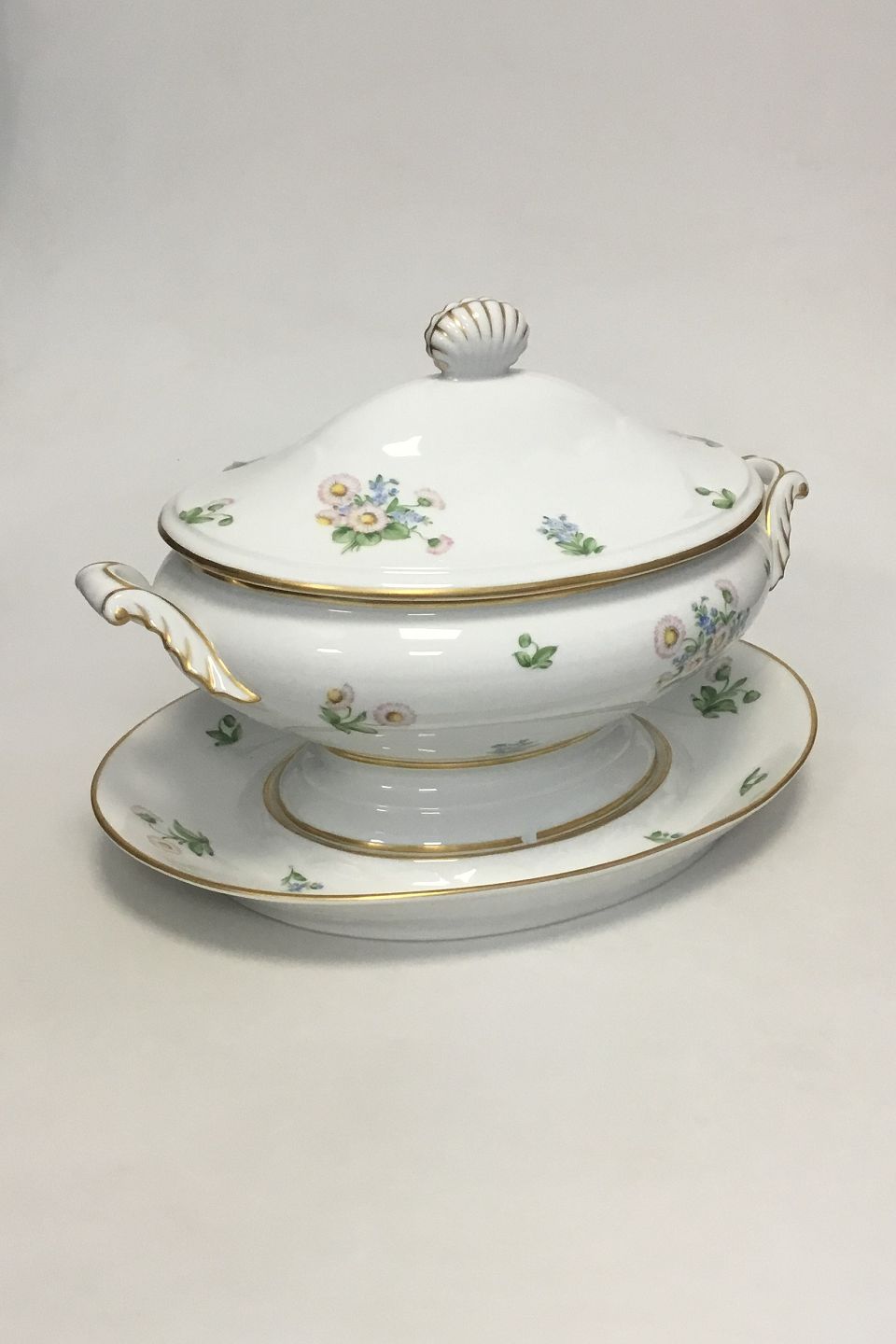 Royal Copenhagen Bellis og Følfod Terrin med låg og underfad No 9056. Måler 39 cm(15 23/64 in.). Har et par små afslag på kanten