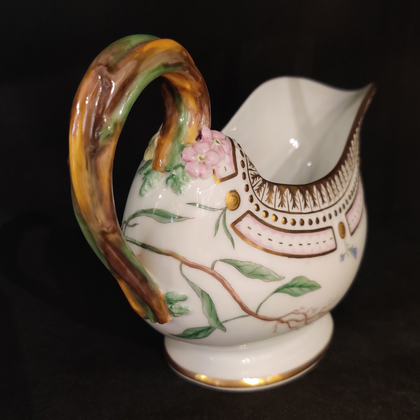 Dekoreret i farver, blomster og guld, hank i form af gren.