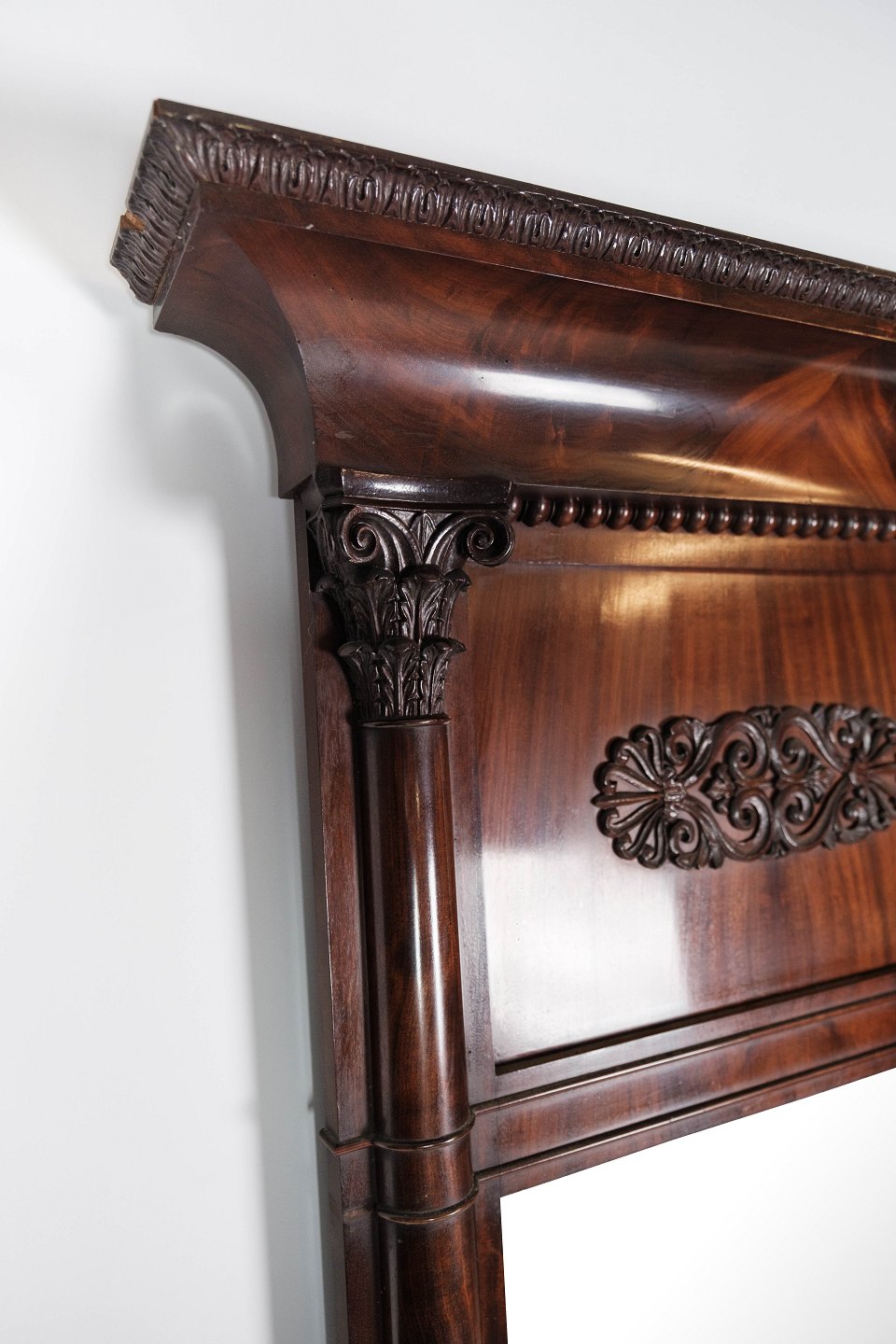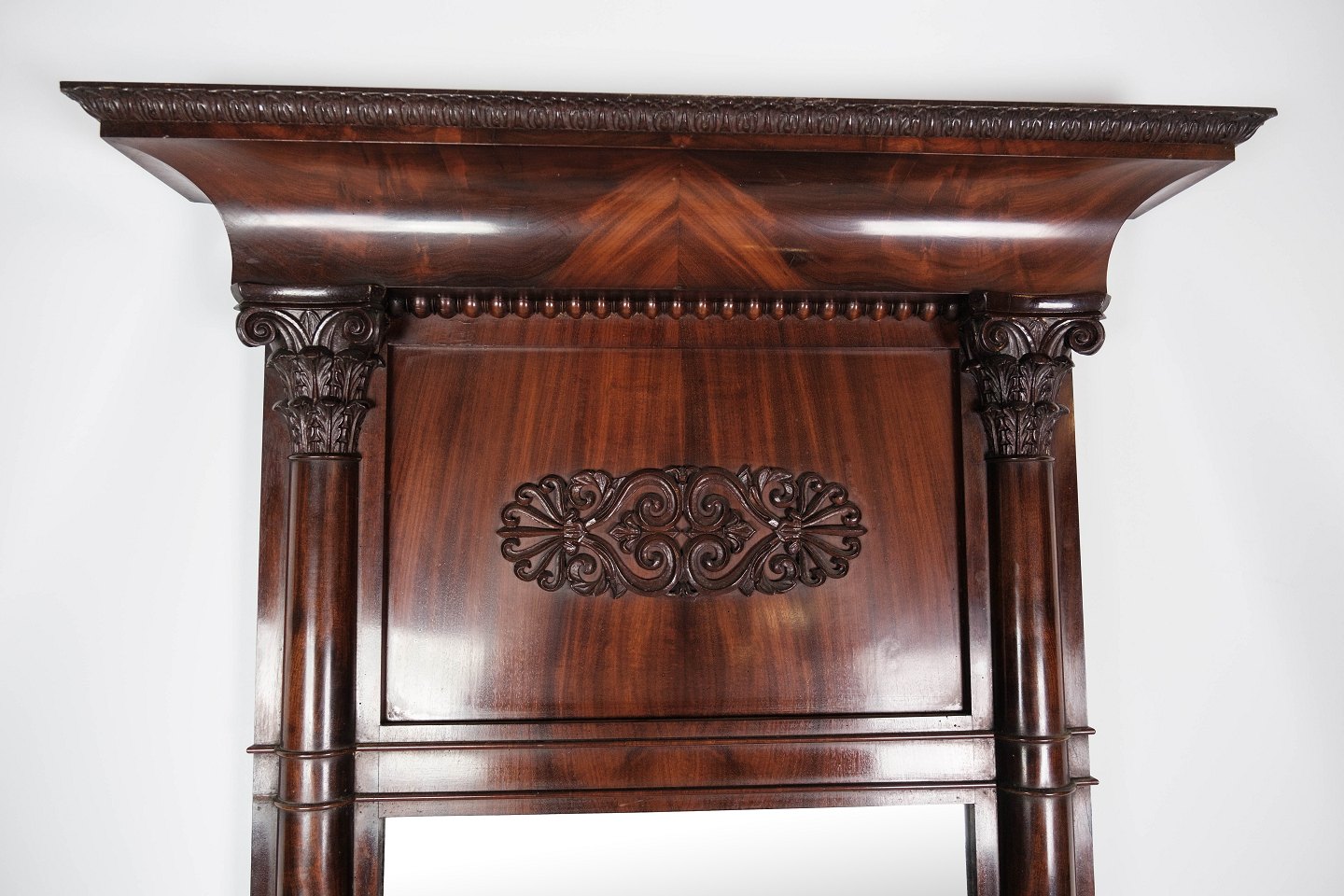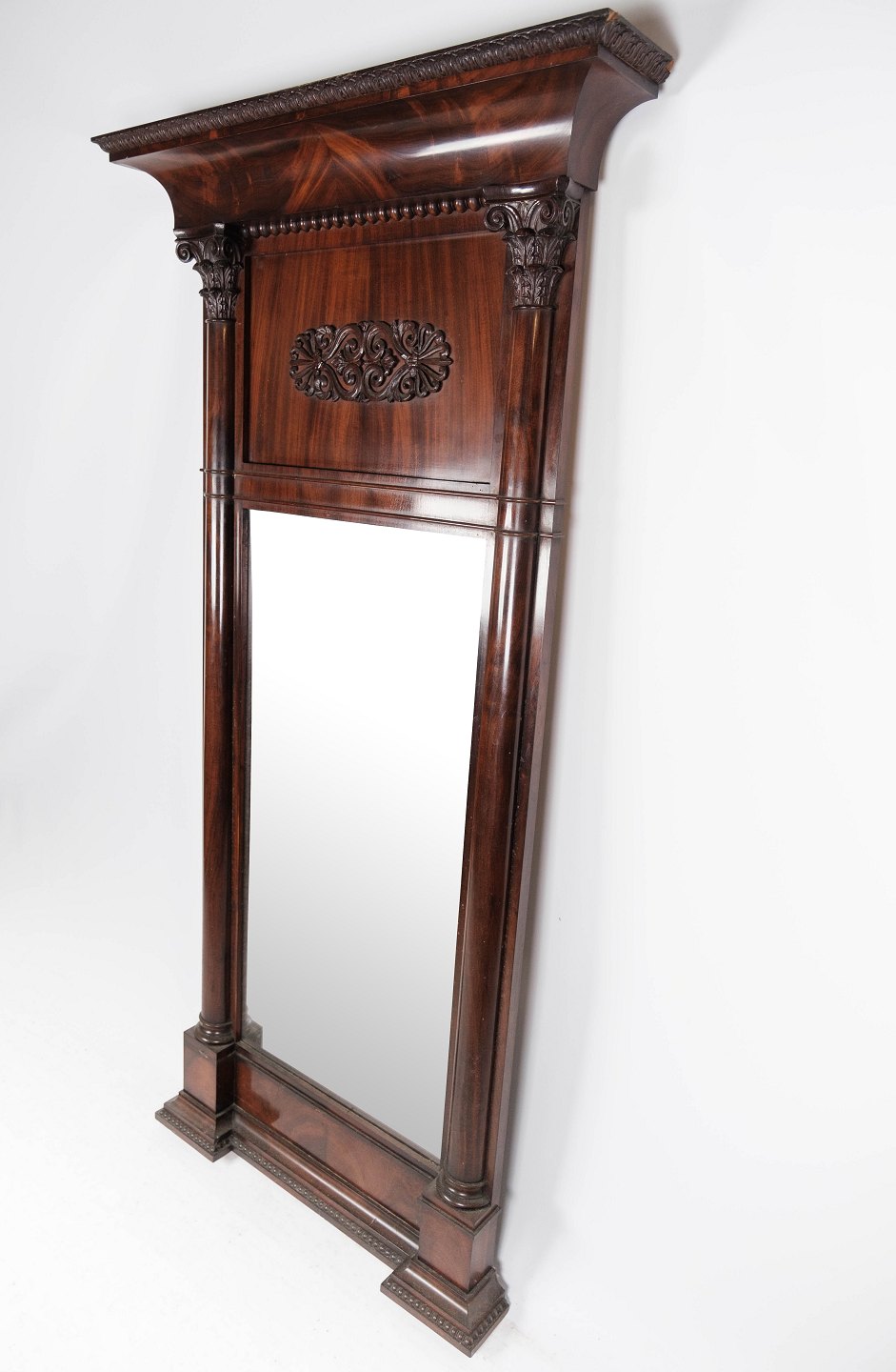 Tall mirror of mahogany with carvings, in great antique condition from around 1840.