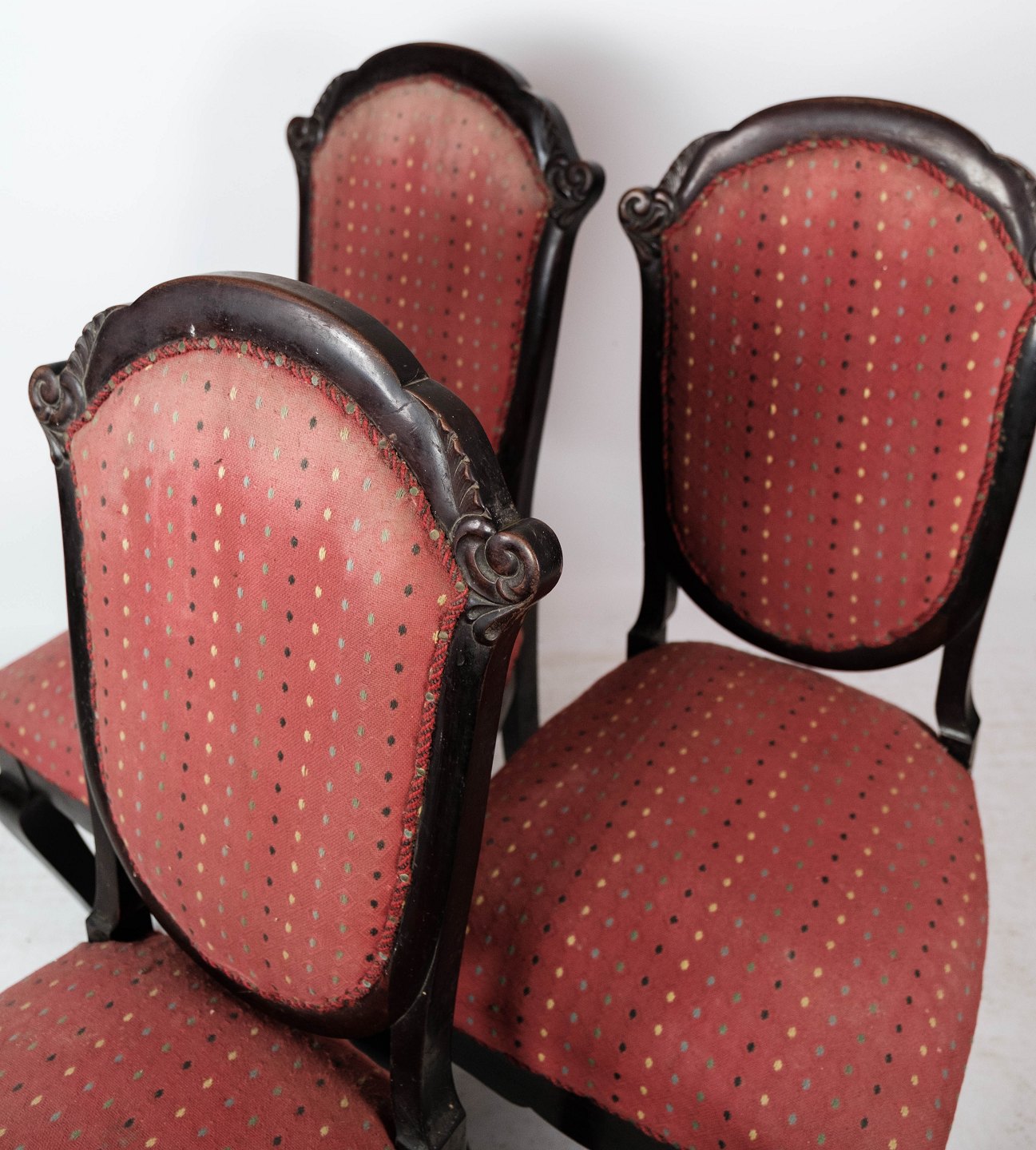 Sæt af tre spisestuestole af mahogni og polstret med rødt stof fra omkring 1920. Stolene er i flot antik stand.
