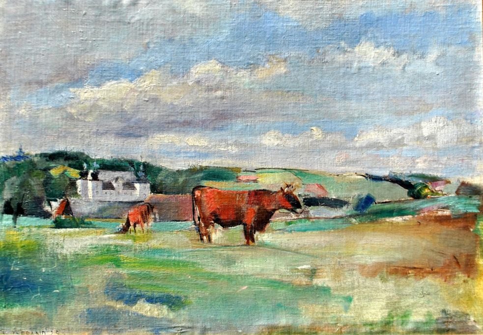 Isbrand, Victor Bagley (1897 - 1989) Danmark: Køer på en mark ved Engelsholm ved Bredsten.
