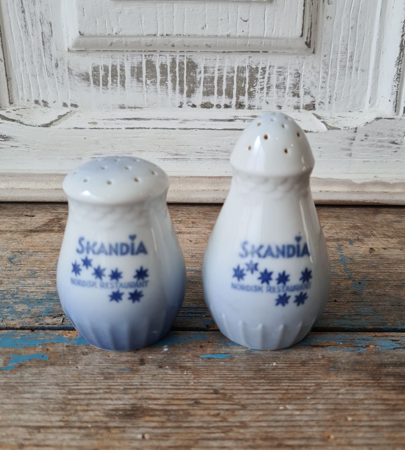 B&G Blue Tone salt and pepper set with logo "Skandia Nordisk Restaurant"