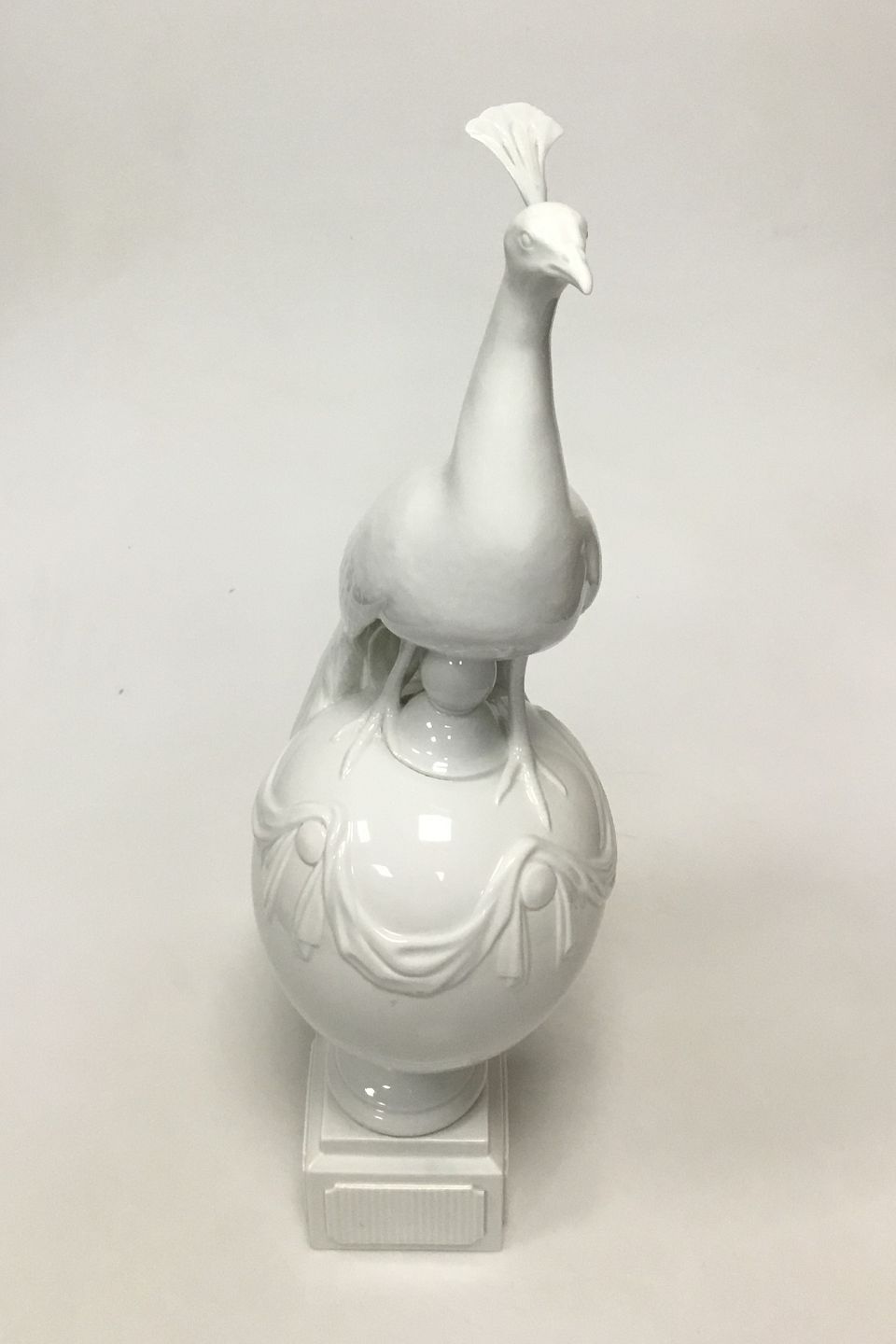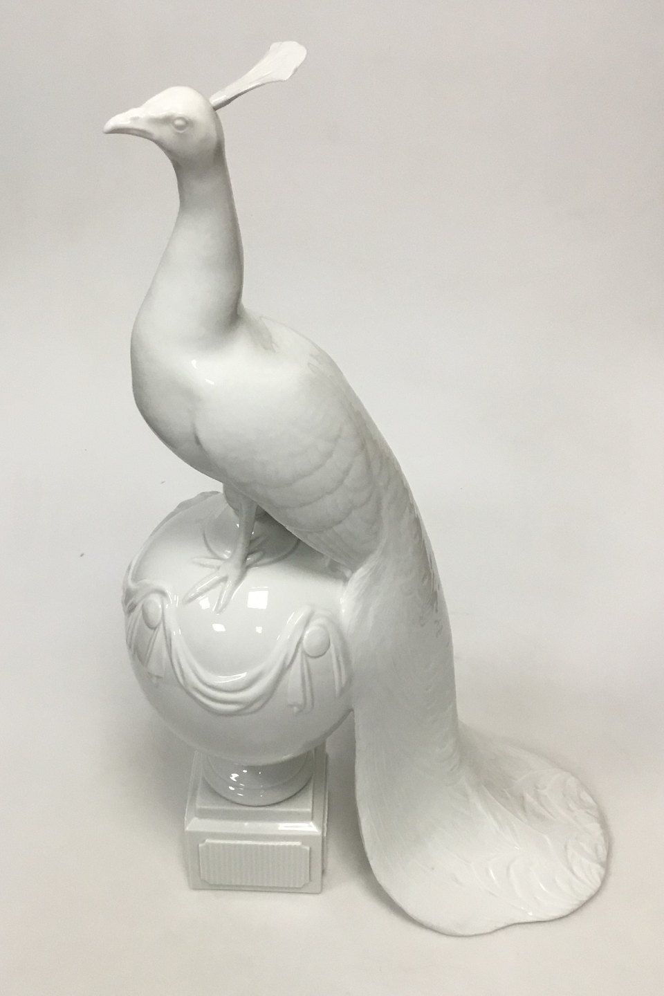 Royal Copenhagen Figurine of Peacock on ball. Designed by Arnold Krog. Measures 55 cm / 21 21/32 in. 2nd Quality. The figurine is a bit crooked. Top feathers on peacocks head can be taken off.