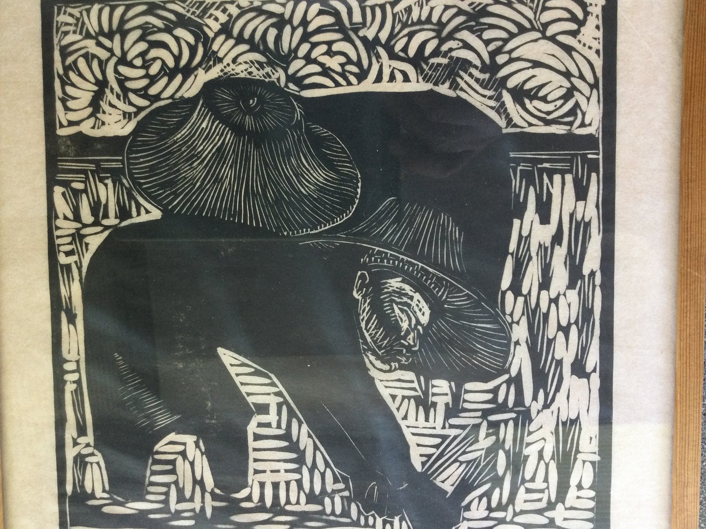 Text available in Danish: Linoleumssnit af Per Ulrich - Arbejdere i Rismarken.