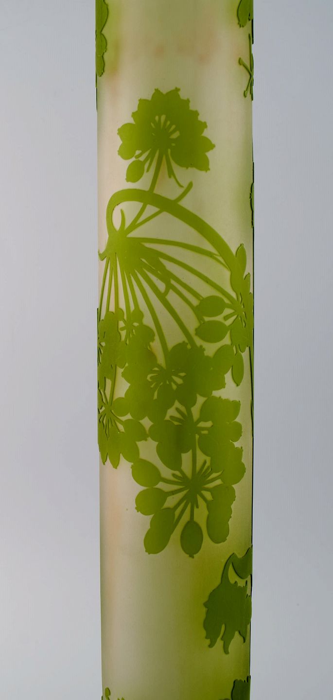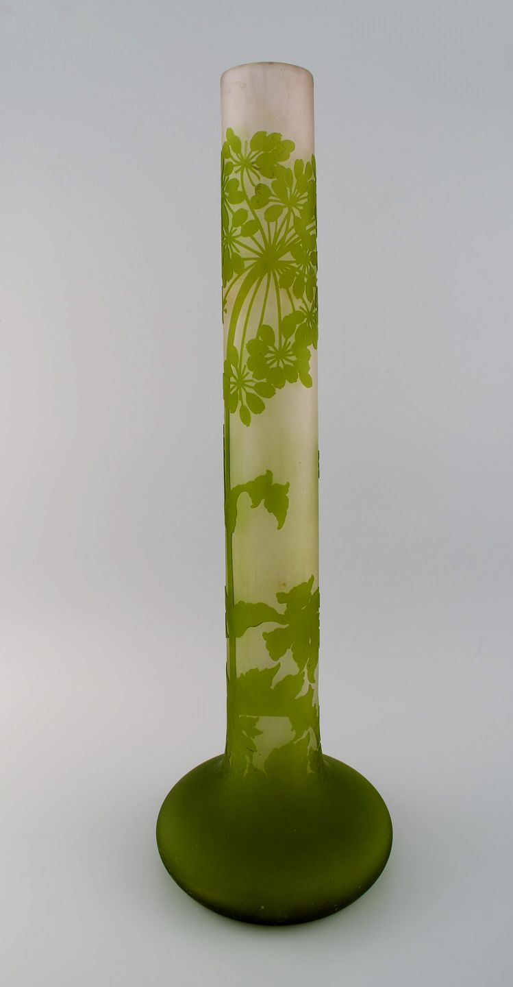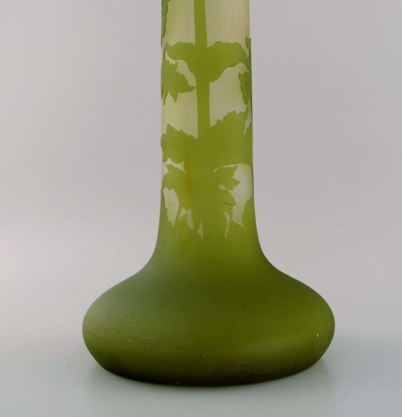 Gigantisk Emile Gallé vase i matteret kunstglas med grønt overfang udskåret med motiver i form af bladværk. Tidligt 1900-tallet.