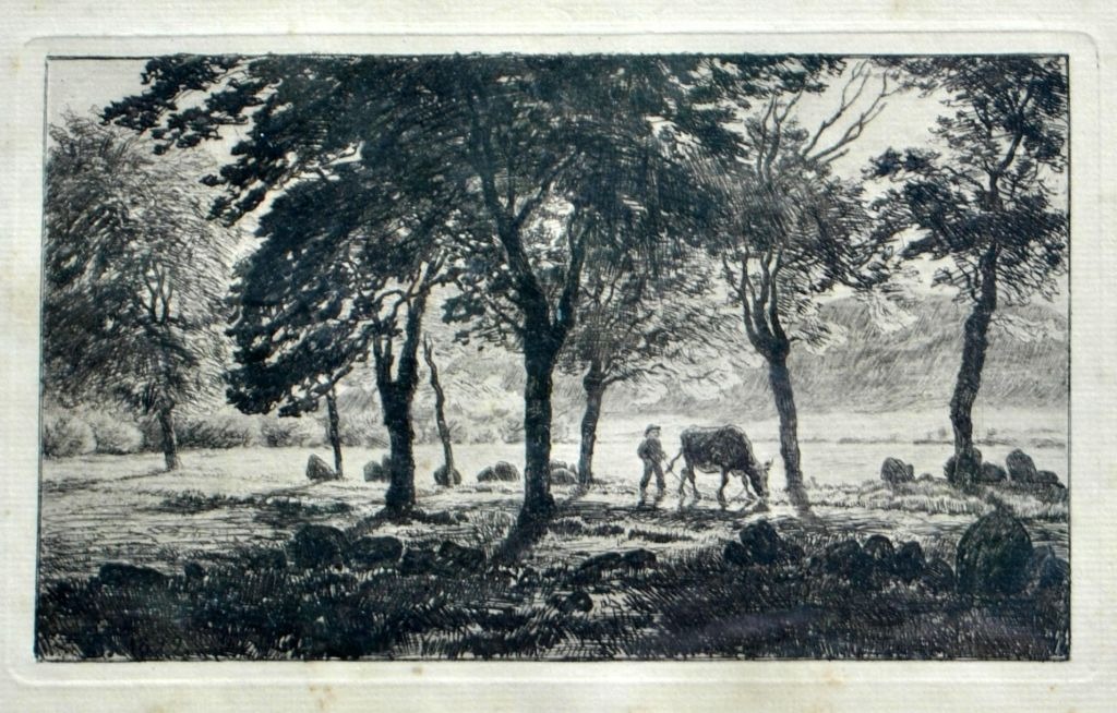 Skovgaard, Niels Christian (1858 - 1938) Danmark.En mand med en ko på vejen. Radering. Signeret: Monogram 1899. 12,5 x 20 cm.