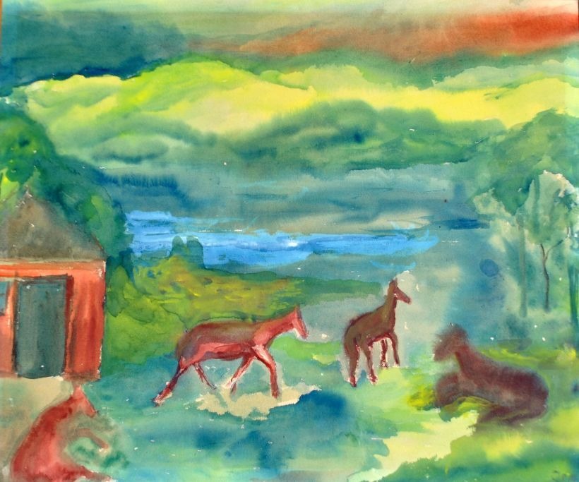 Nielsen, Jens (1891 - 1978) Danmark: Heste på en mark. Akvarel. Signeret. 44 x 54 cm.
