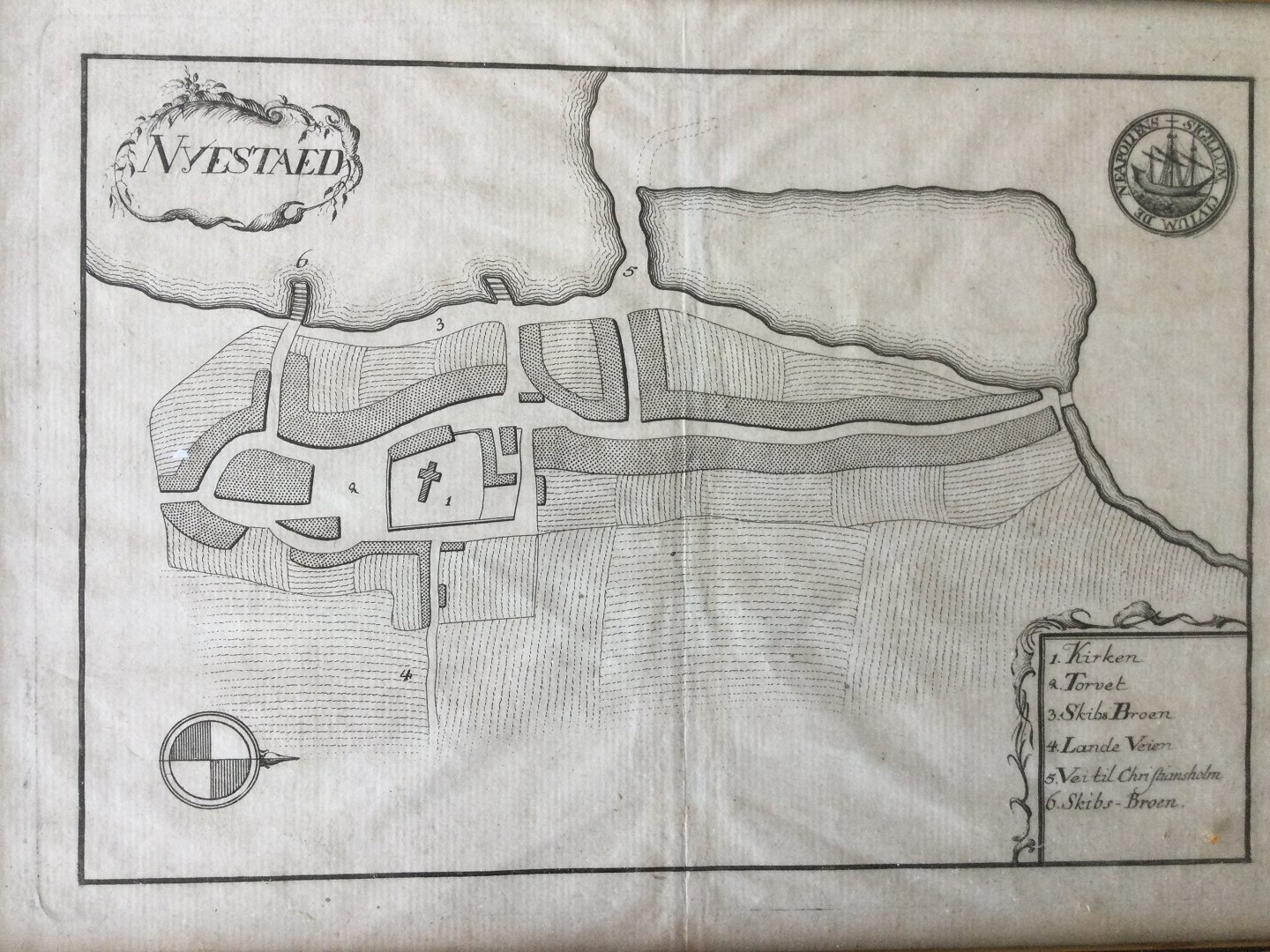 Text available in Danish: Gammelt kobberstik af Erik Pontoppidan - Kort over Nysted - fra Danske Atlas 1767.