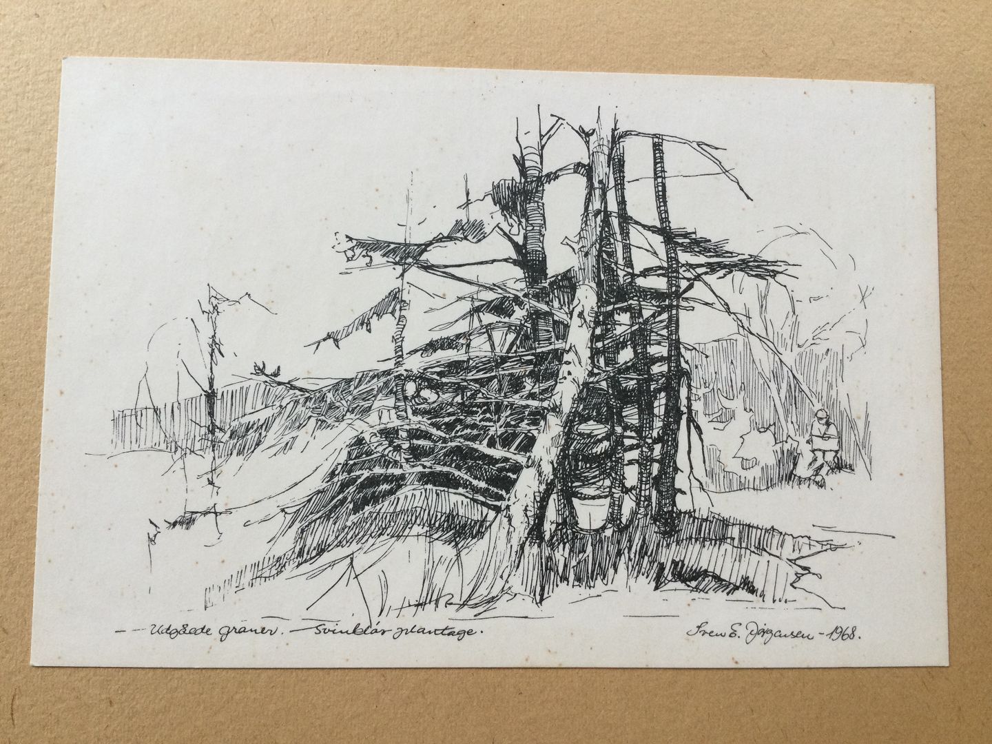 Text available in Danish: Tegning af Sven Erik Jørgensen 1968 - Udgåede graner i Svinkløv Plantage.