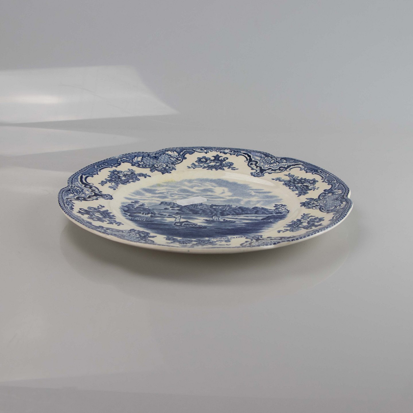 Tallerken i lys ironestone med blådekoreret slotsmotiv.