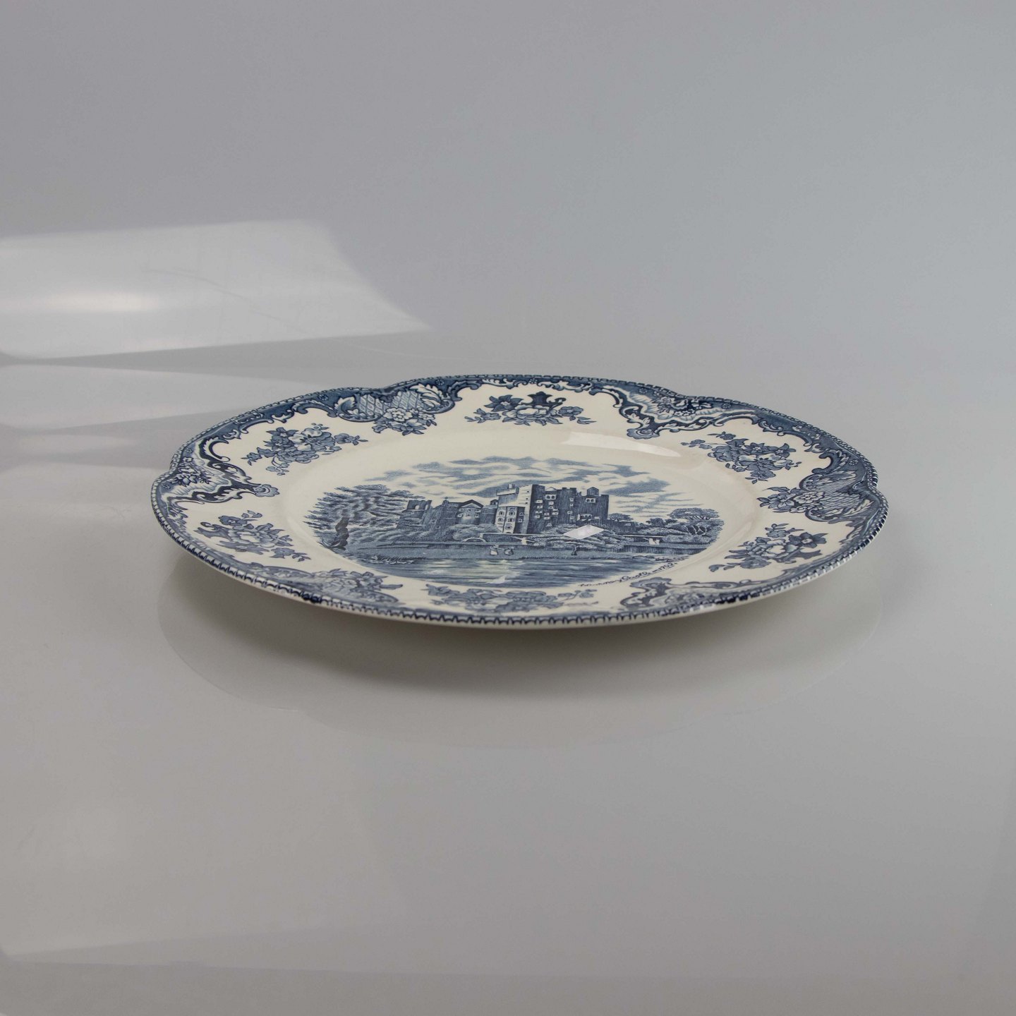 Tallerken i lys ironestone med blådekoreret slotsmotiv.