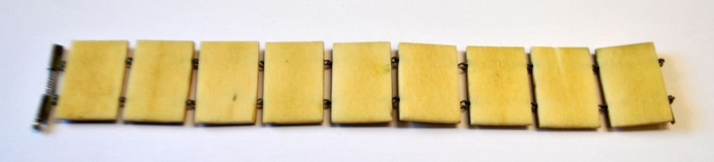 Persisk armbånd, 20. årh. Benstykker med polyrkome håndbemalede scener af siddende mænd og geometriske mønstre. L.: 18 cm. H: 2,8 cm.