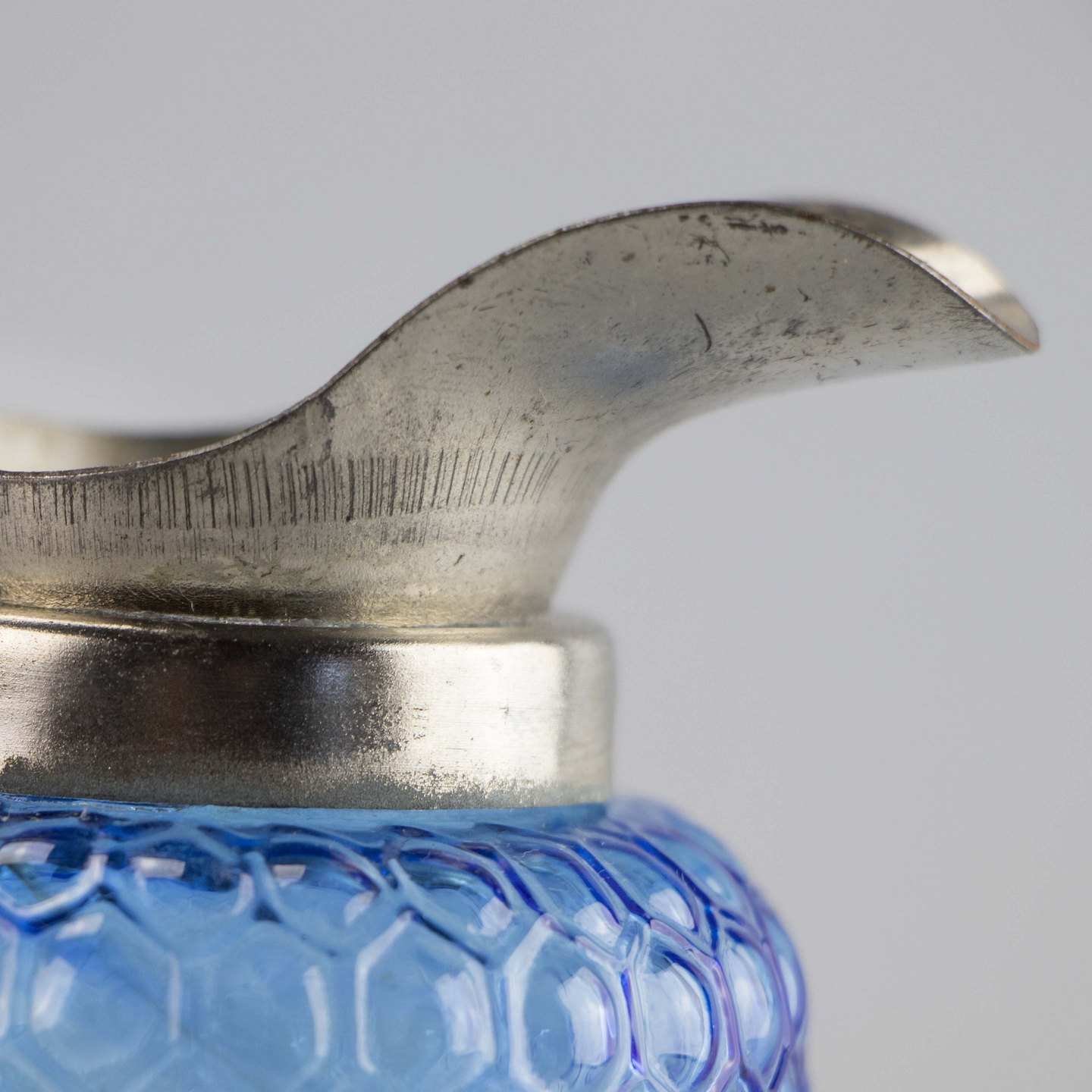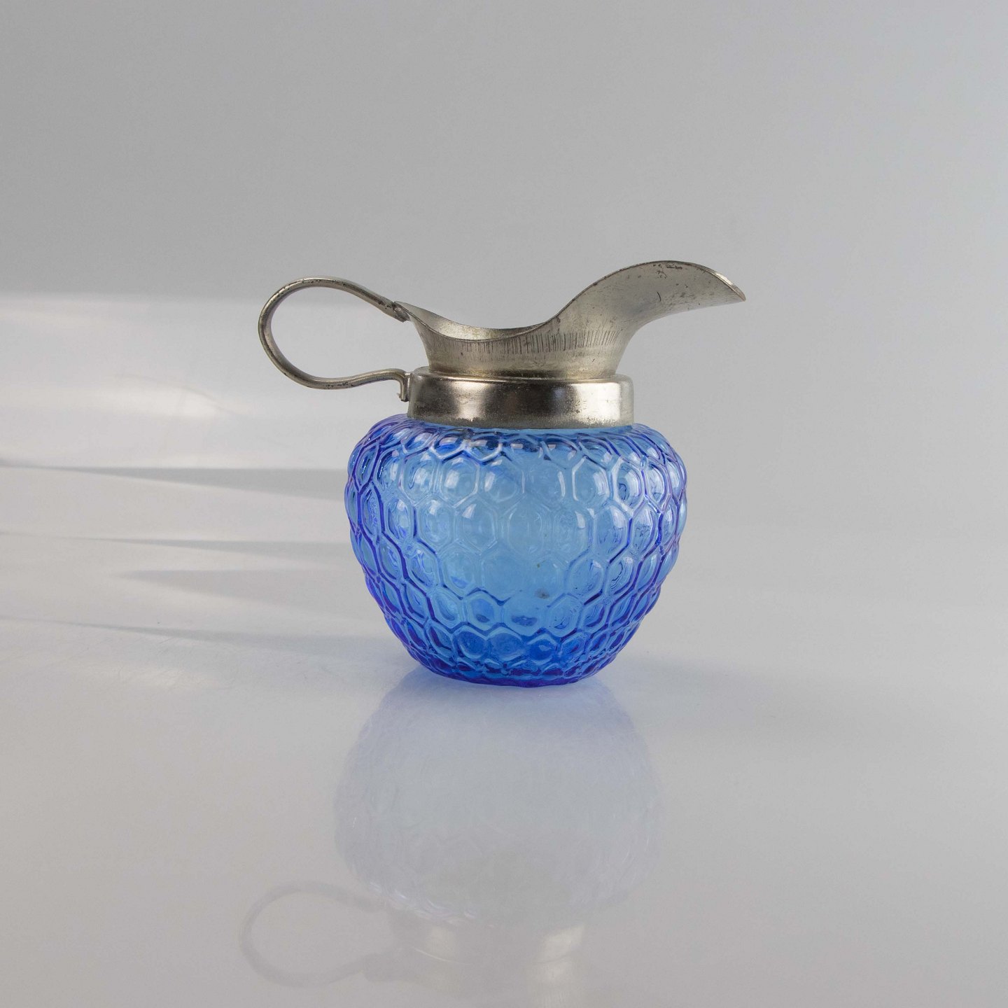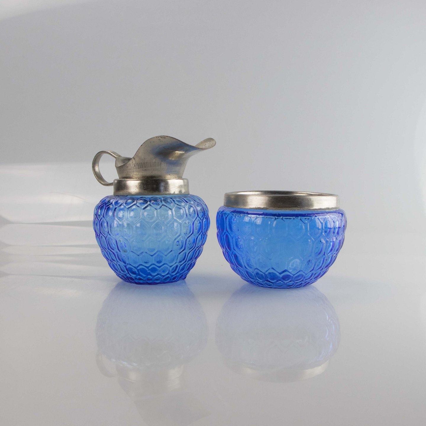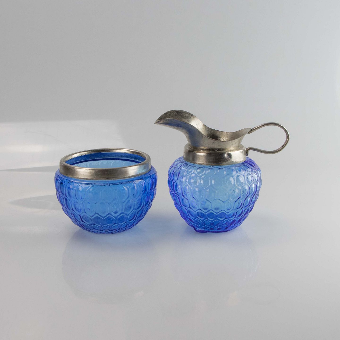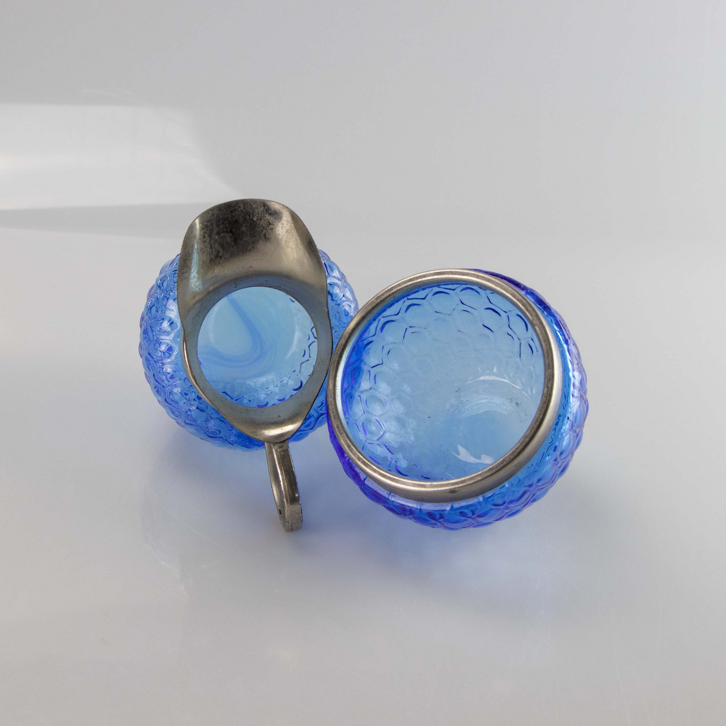 Sættet er udformet i blåt presset glas med forsølvet kant.