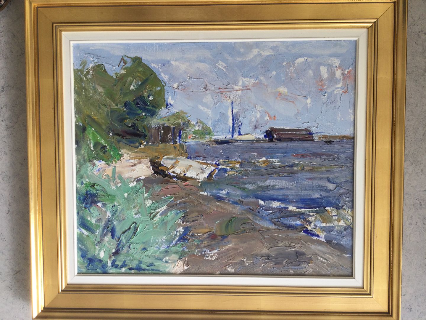 Maleri af Børge Bokkenheuser - Kystparti med båd på strand.