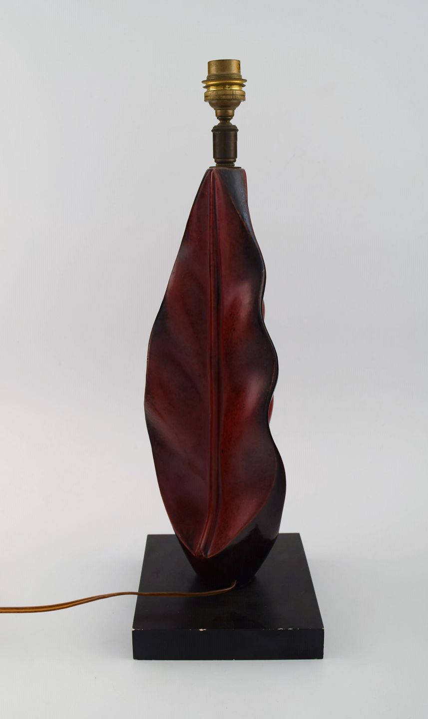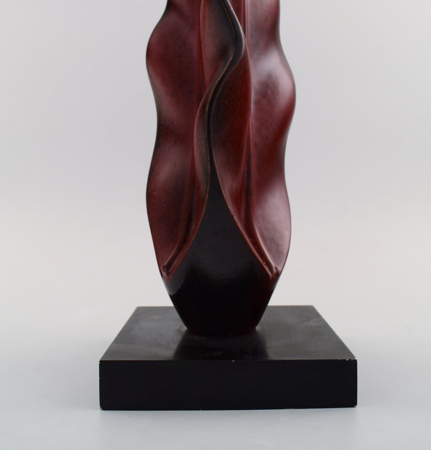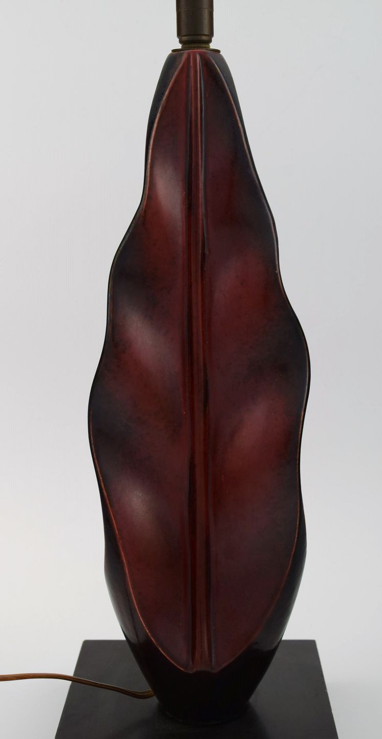 Organisk formet bordlampe i håndmalet træ på sokkel. Midt 1900-tallet.