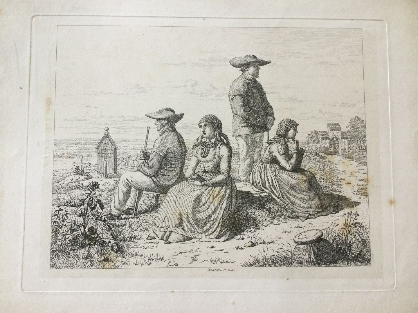 Radering af Jacob Kornerup 1858 - Skånske Bønder på Kirkegården.