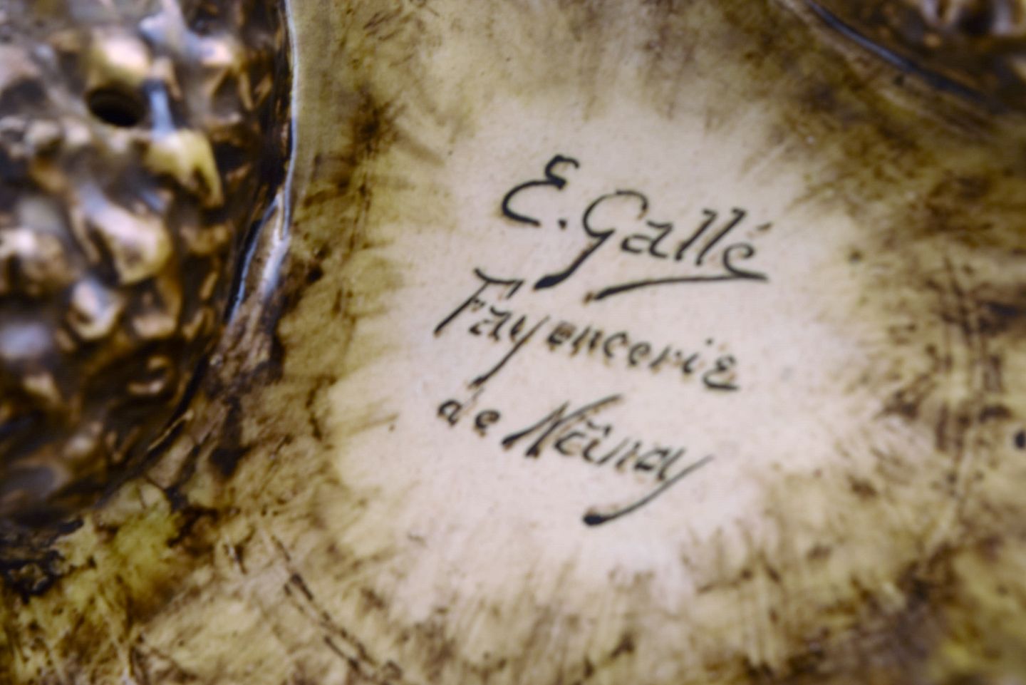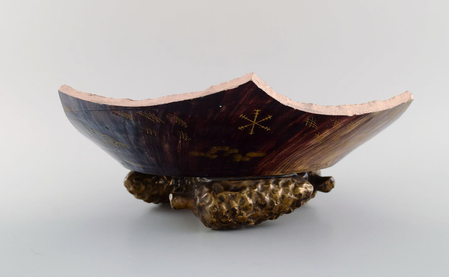 Emile Gallé for St. Clement, Nancy. Antik art nouveau skål i håndmalet fajance med fødder formet som grankogler. Ca. 1880.