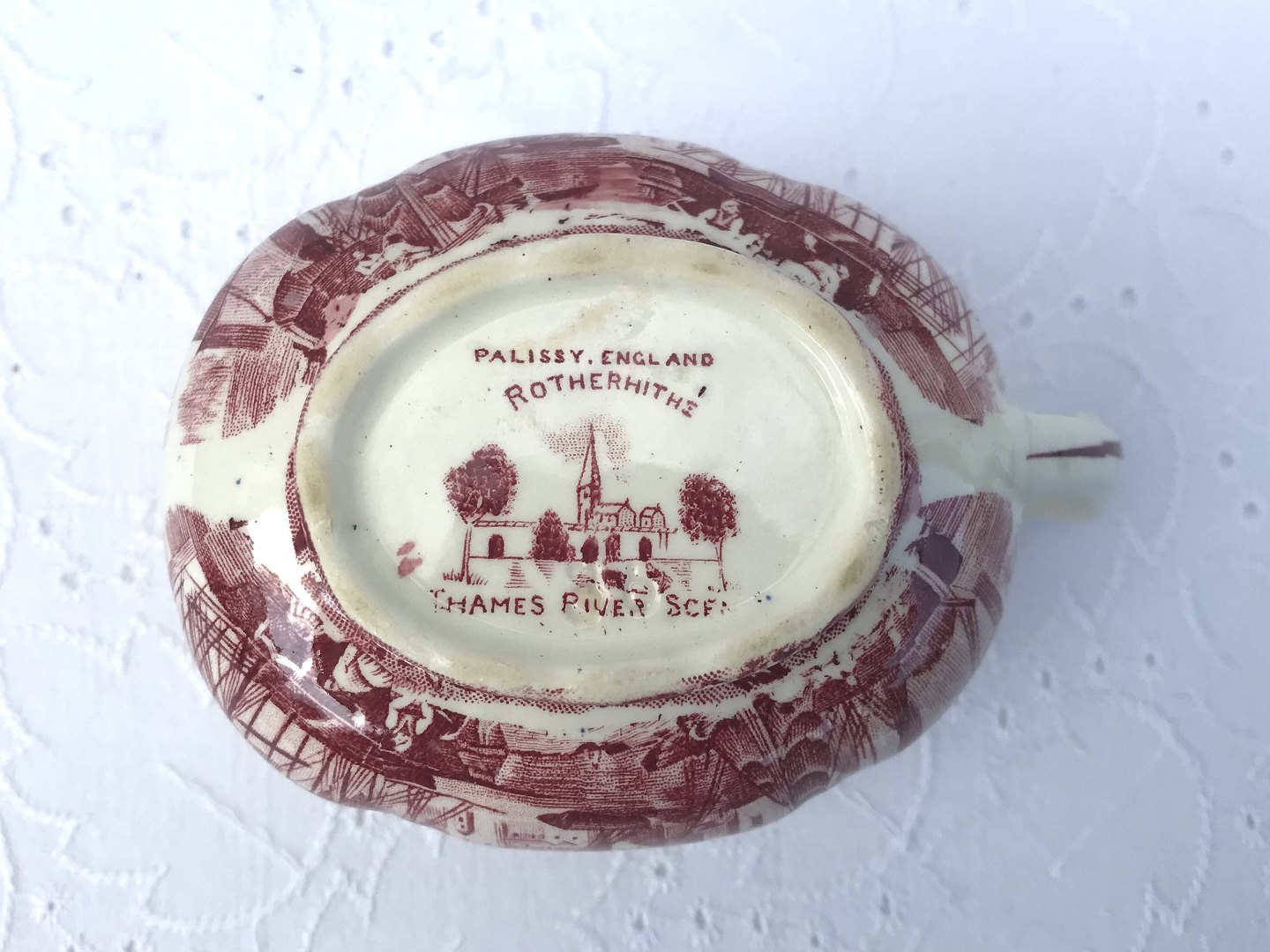 | Engelsk fajance, Palissy pottery, Thames river scenes, Rød, Flødekande, 12,5cm bred, 6,5cm høj *Pæn stand*