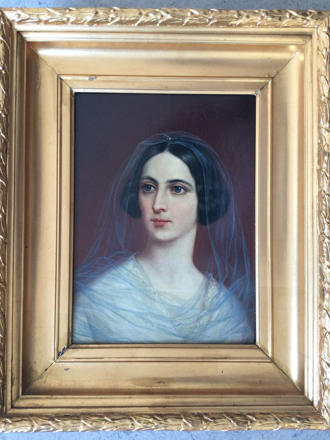 Portræt af ung, sorthåret kvinde med florlet slør monteret med diamantnål i håret.