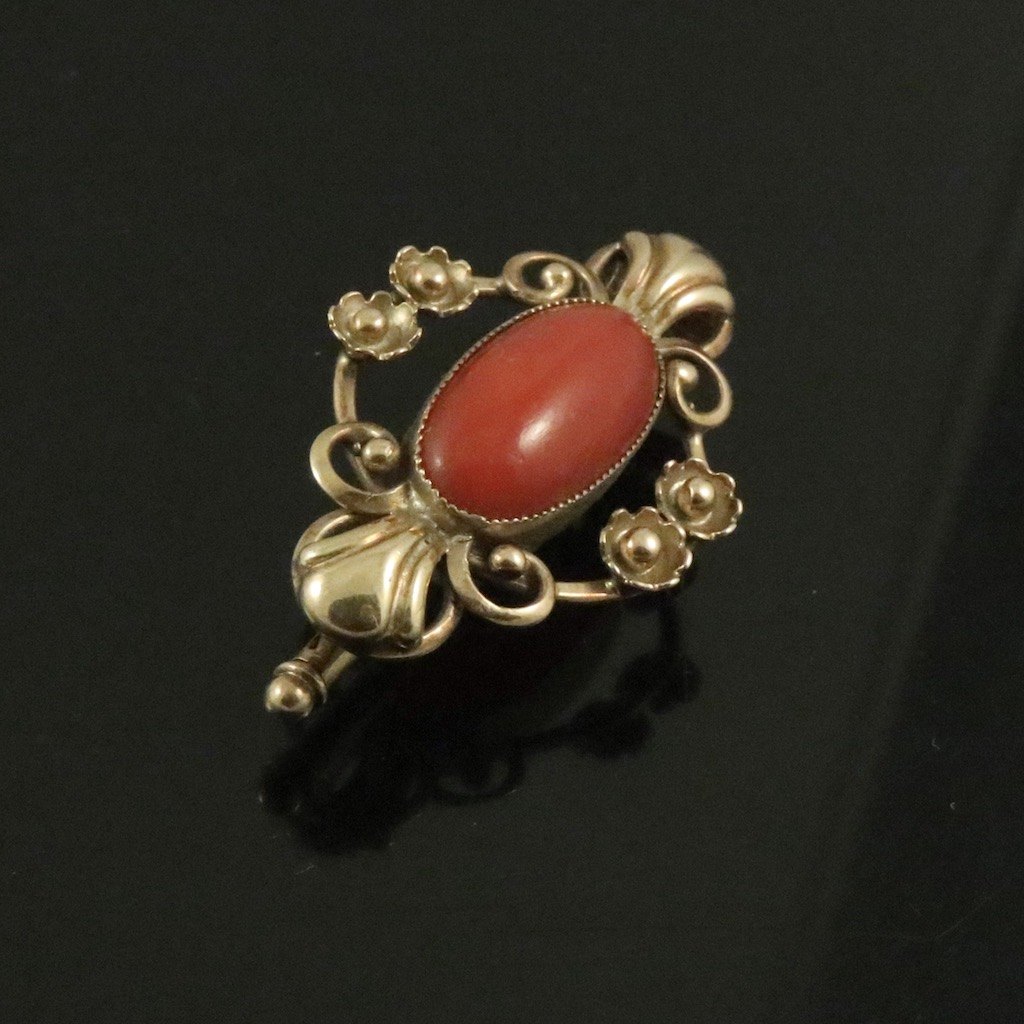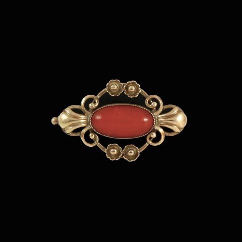 Skønvirke broche i 14k guld med koral.