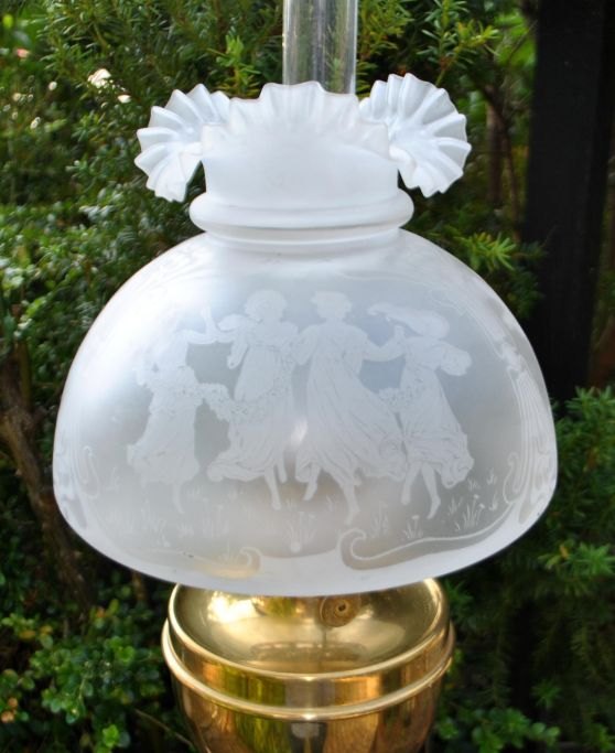 Large petroleum lamp, approx. 1900, Denmark. Square foot with four ball legs. Profiled stem. Smooth container. Screen with etchings and motif with four young women. H .: 86 cm.