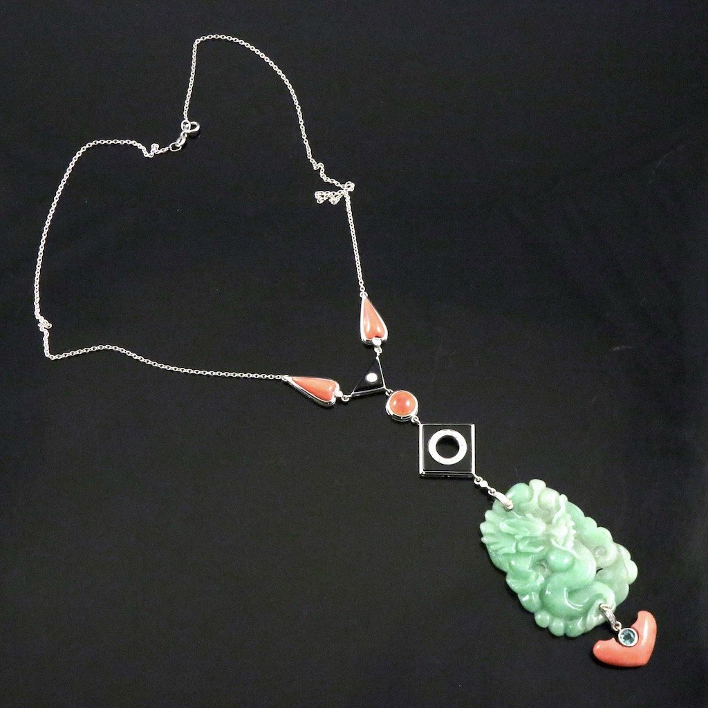 18k White Gold Necklace with Jade, Tourmalin, Coral & Diamonds.