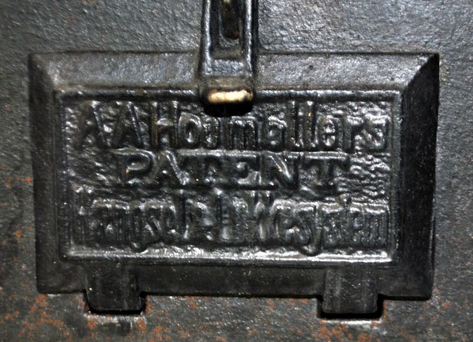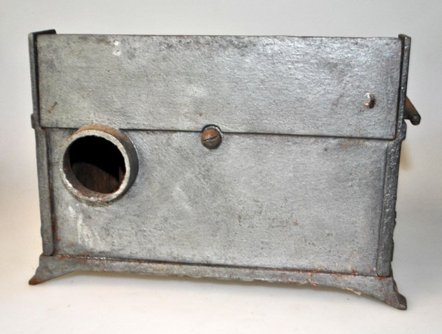 Fungerende støbejerns barne komfur, J. A. Christensen & Co., Nykjøbing Jylland, 1889. Stemplet på siderne. Låge stemplet A. A. Houmøller Patent, Hængsel og Lukkesystem. L. 24 cm. B.: 14 cm. H.: 16 cm.