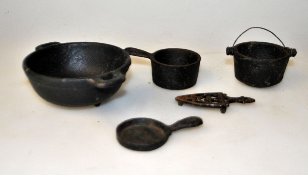 Incl. 3 støbejerngryder, en pande og fod til strygejern. Perfekt stand!