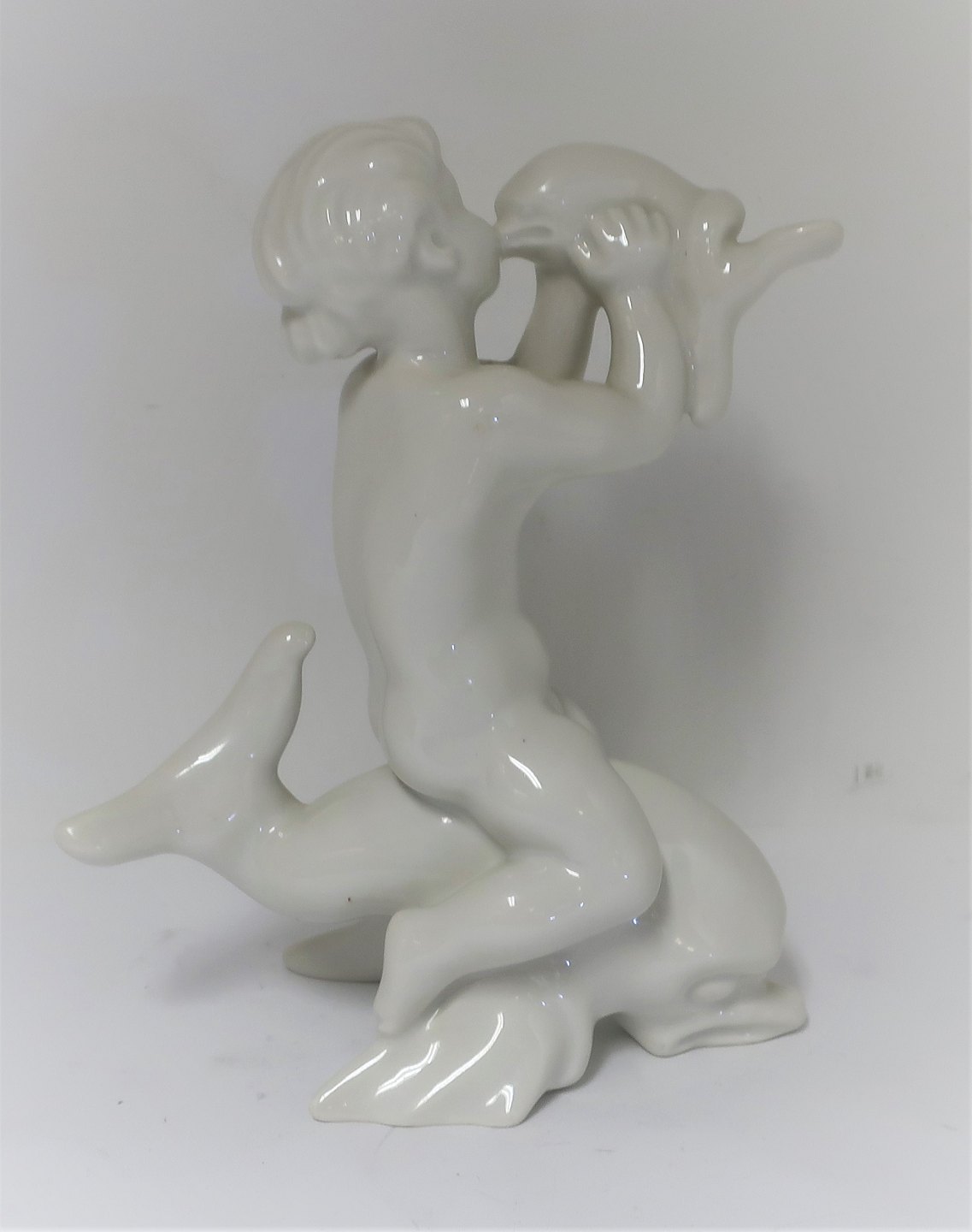 Bing & Grondahl. Porcelain figure. Kai Nielsen. Sea child on dolphin, blanc de chine. Height 18 cm. (1 quality)