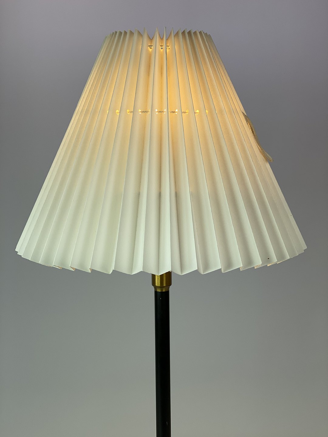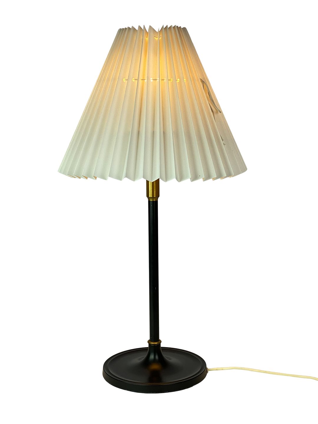 Bordlampe med stel af sort metal og messing med papir skærm, af dansk design af Le Klint fra 1960erne. Lampen er i flot brugt stand.