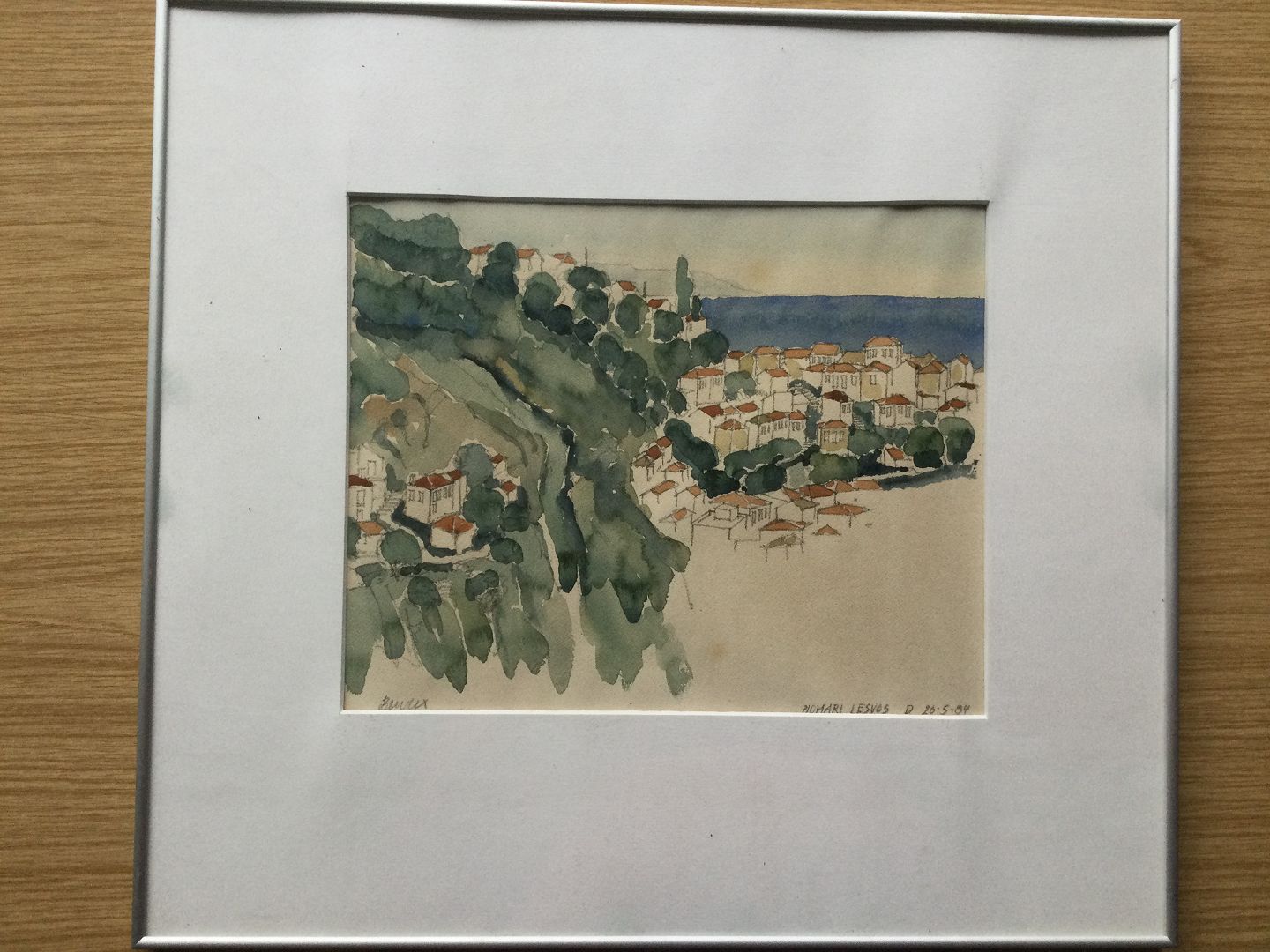 Akvarel af Hans Bendix Pedersen - Parti fra Plomari, Lesbos, Grækenland 1984.