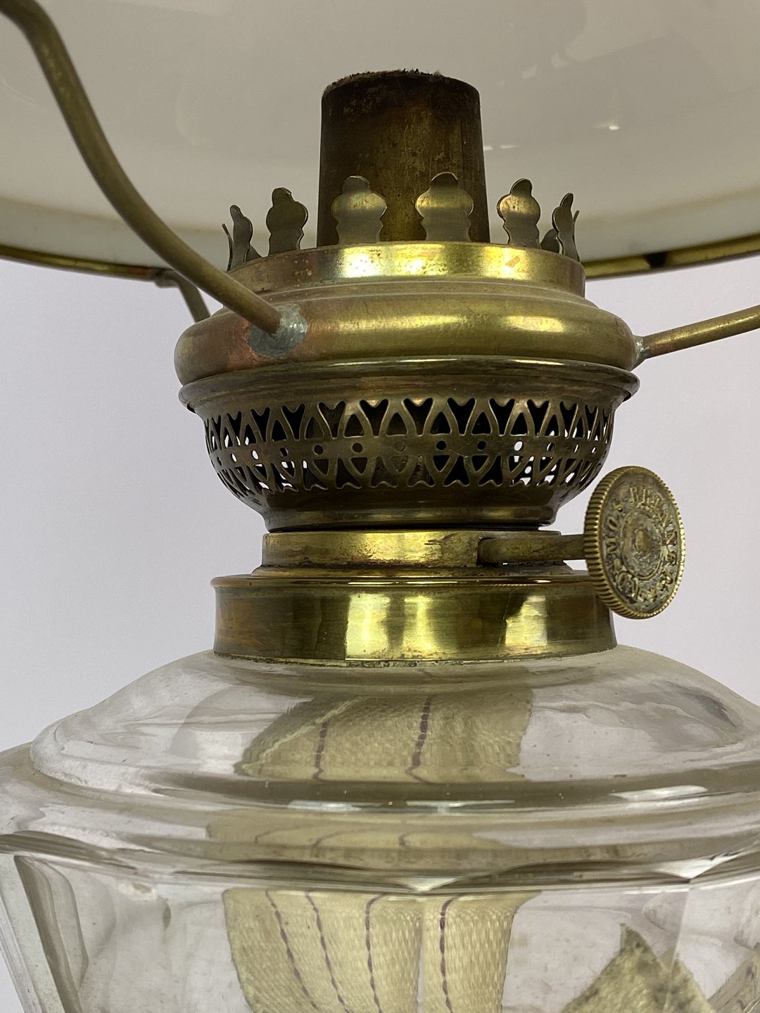 Petroleumslampe af messing med skærm af hvid opal skærm fra omkring 1860.