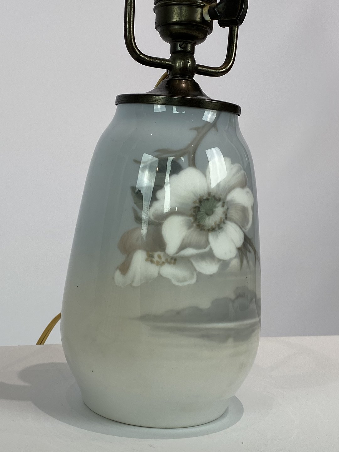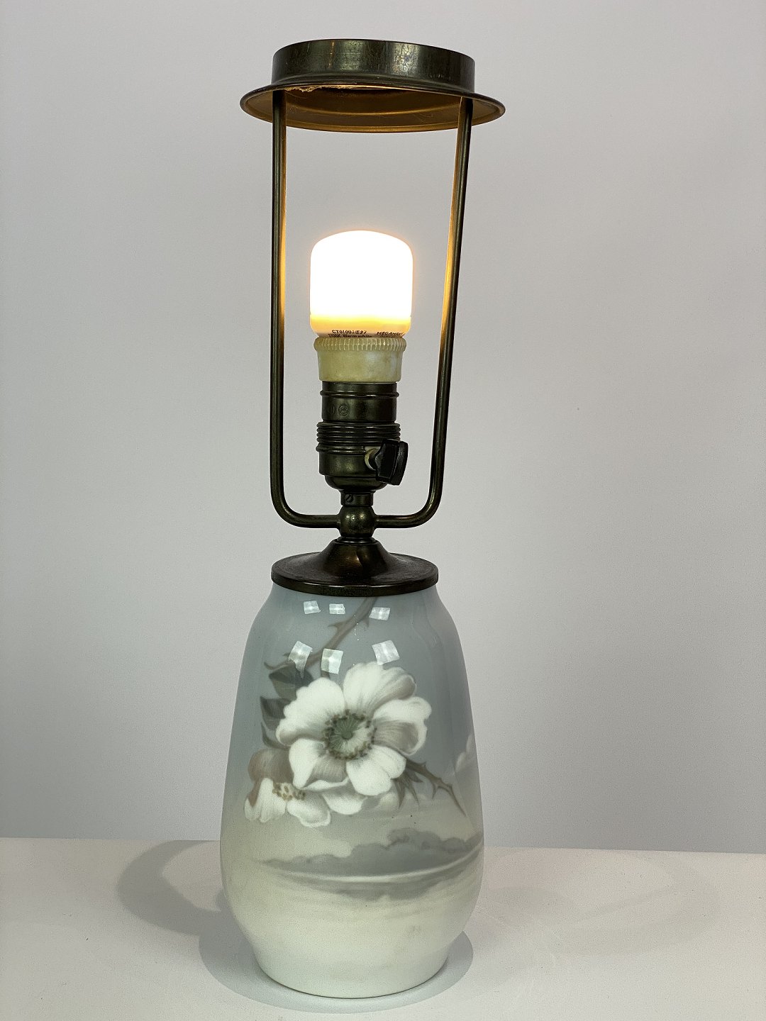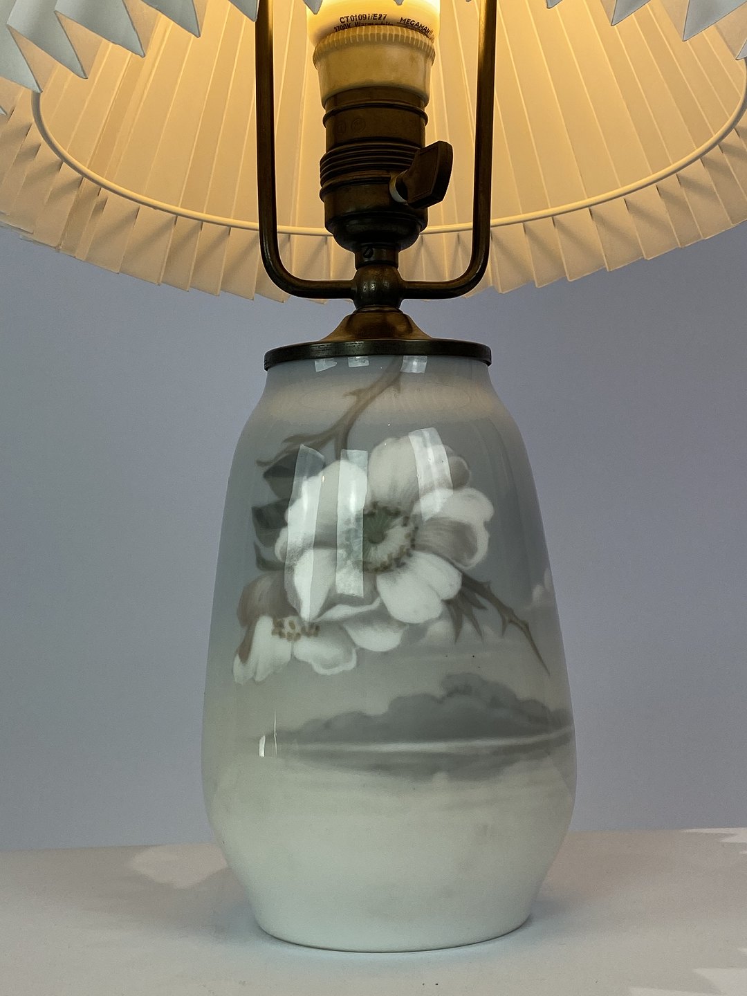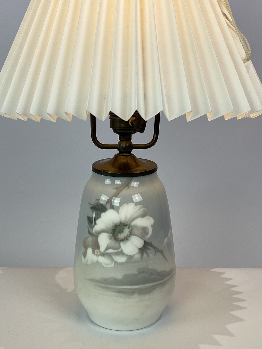 Kgl. porcelæn lampe med blomster motiv og papir skærm.