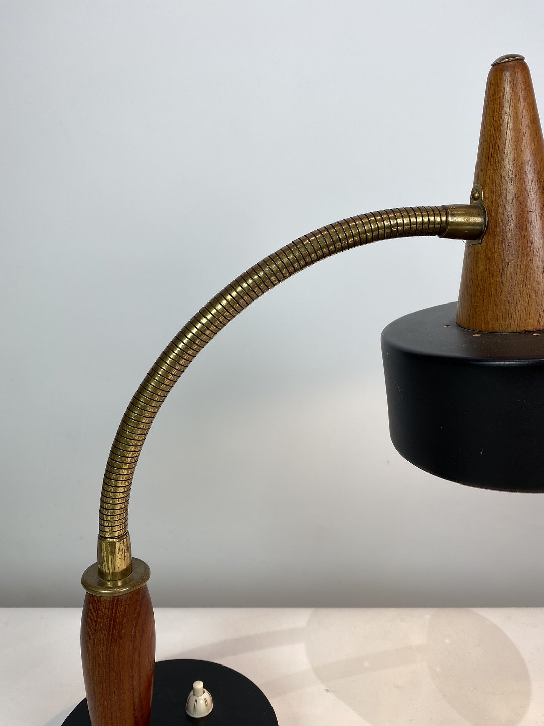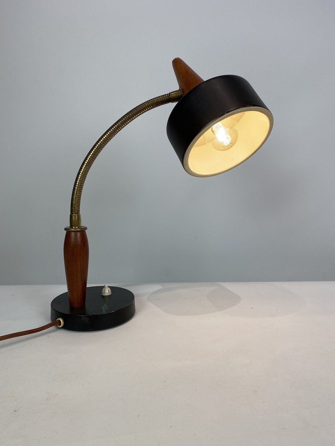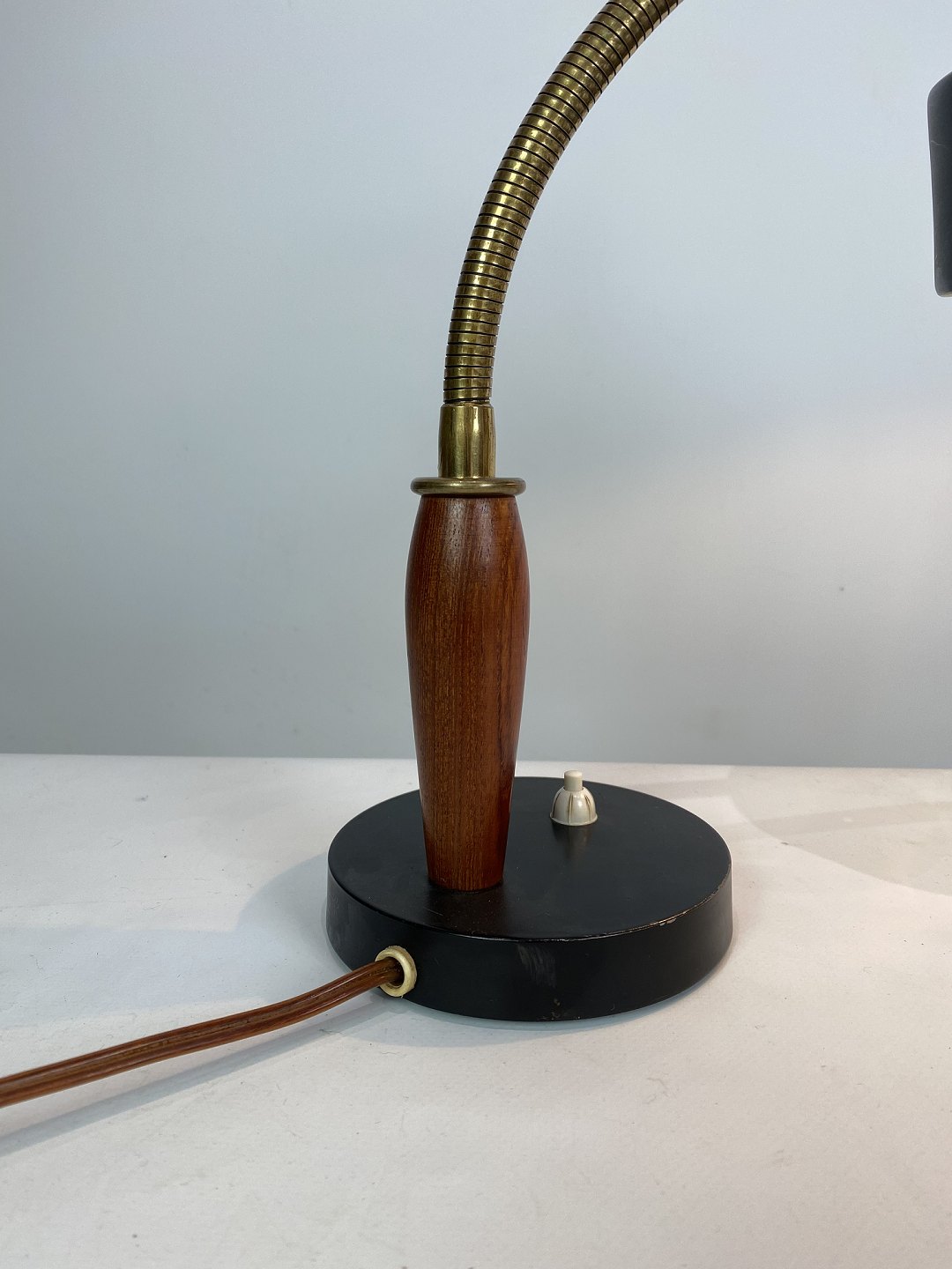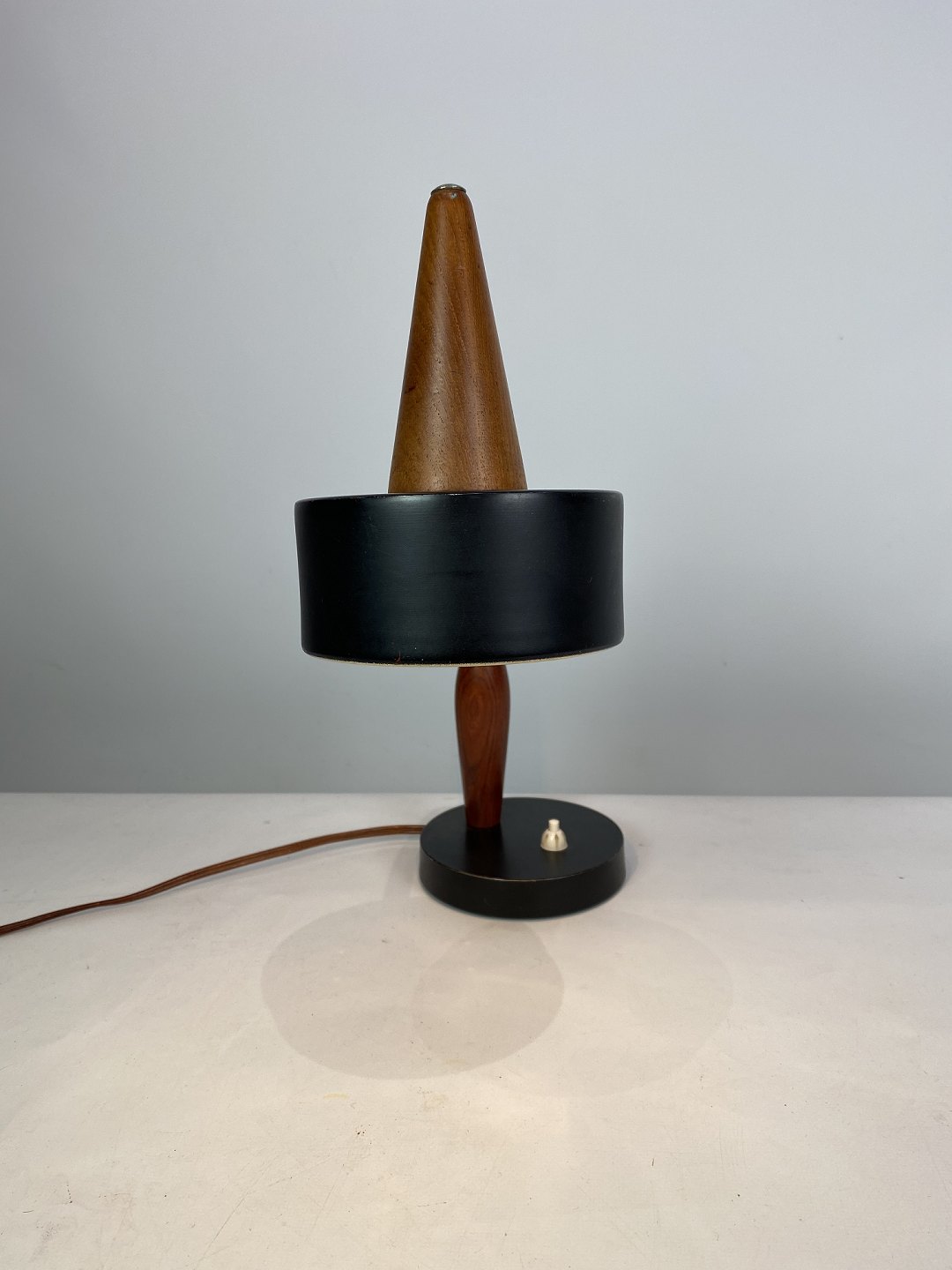 Bordlampe af sort metal og teak af dansk design fra 1960erne.