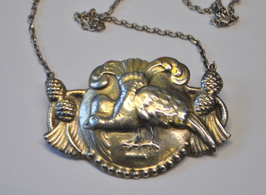 Halskæde/vedhæng i sølv, 20. årh. Dekoreret med urfugl.