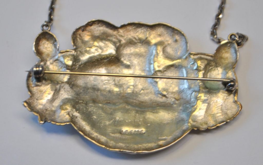 Halskæde/vedhæng i sølv, 20. årh. Dekoreret med urfugl. Stemplet: J.B. Med kæde. Kædelængde: 48 cm. Vedhæng: 4,5 x 7 cm.