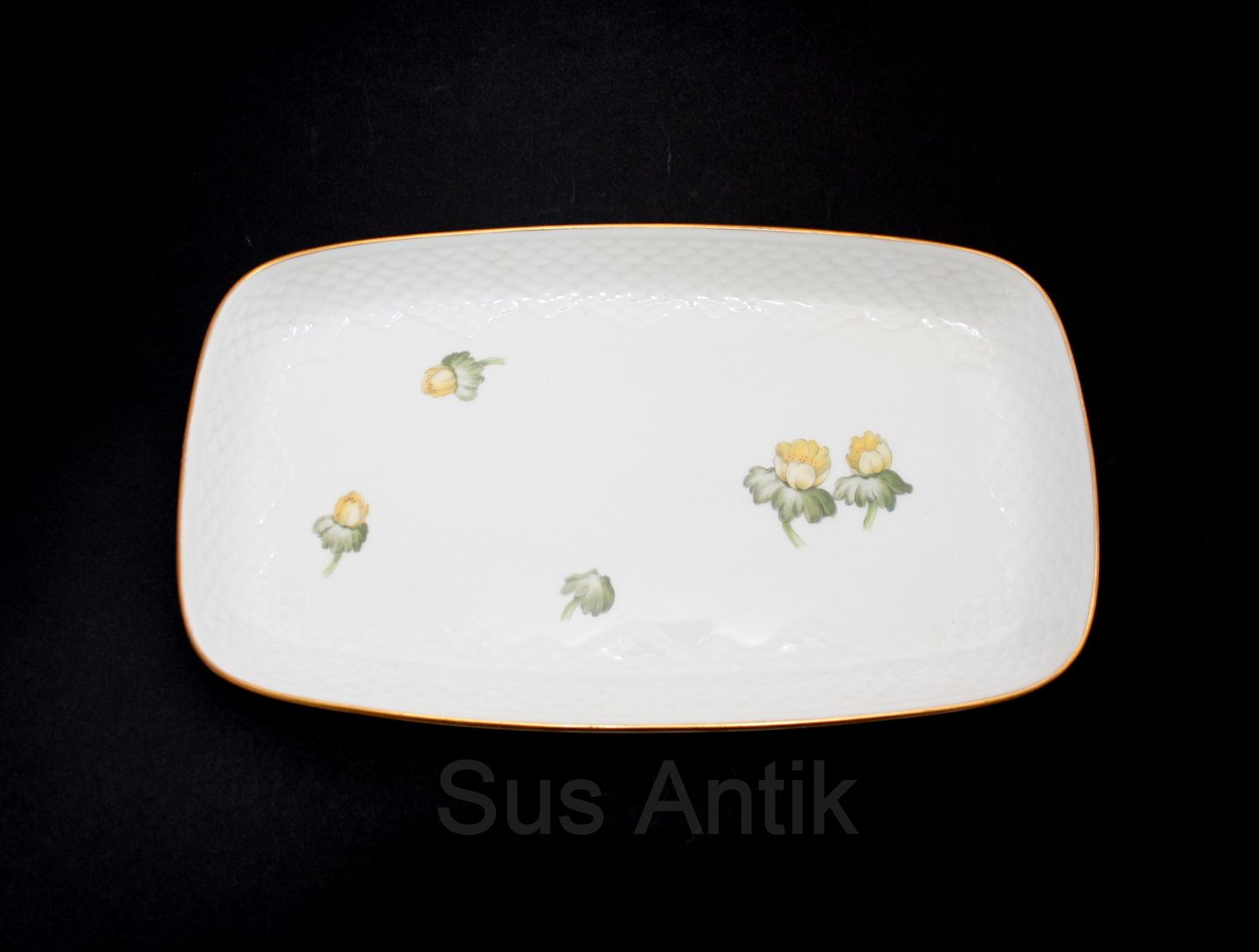 Text available in Danish: Bing & Grøndahl, Erantis, Bakke til sukker og fløde. Nr. 96. 28x16 cm. I. sortering. Pris: 200 kr. stk. Lager: 1