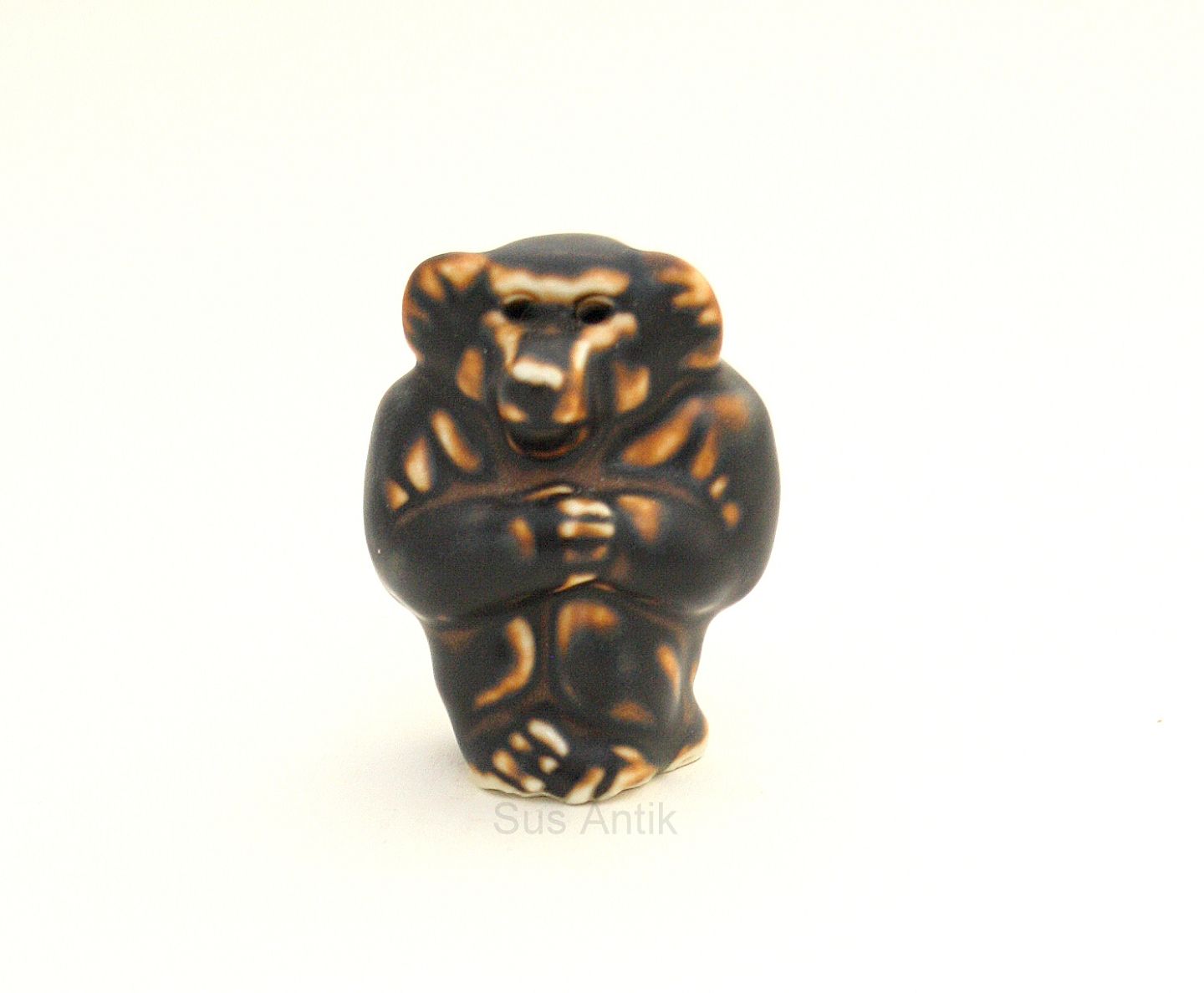 Text zugänglich auf Dänische: Royal Copenhagen, stoneware brun glasur. Abe lille siddende med foldede hænder. Formgivet af Knud Kyhn. Nr. 20209. Højde 6,5 cm. Pris: 375 kr.