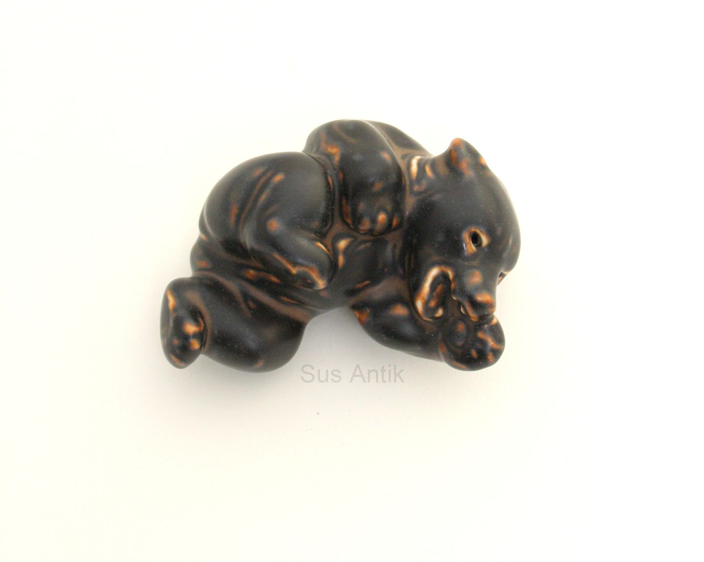 Royal Copenhagen, stoneware, brun glasur. Bjørneunge liggende på siden. Formgivet af Knud Kyhn. Nr. 21432. Længde 9,5 cm. Pris: 150 kr. stk. Lager: 5